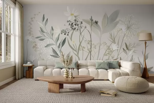 Fototapeten Zarte Wildblumen und Blätter in gedeckten Grün- und Cremetönen vor einem sanften beigen Hintergrund N° w09641