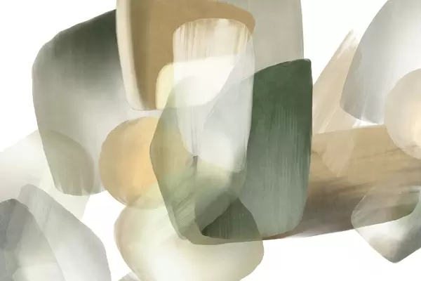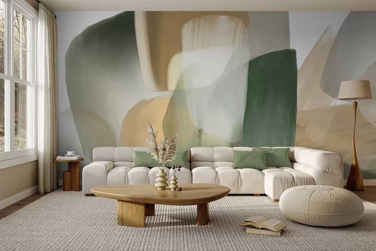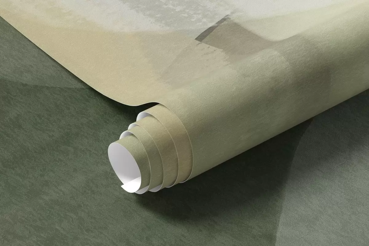 Fototapeten Abstrakte, strukturierte Formen in gedeckten Grün- und Beigetönen, mit weichen Kanten und überlappenden Schichten N° w09642