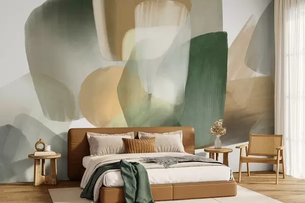 Fototapeten Abstrakte, strukturierte Formen in gedeckten Grün- und Beigetönen, mit weichen Kanten und überlappenden Schichten N° w09642