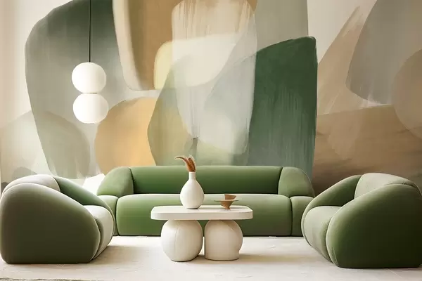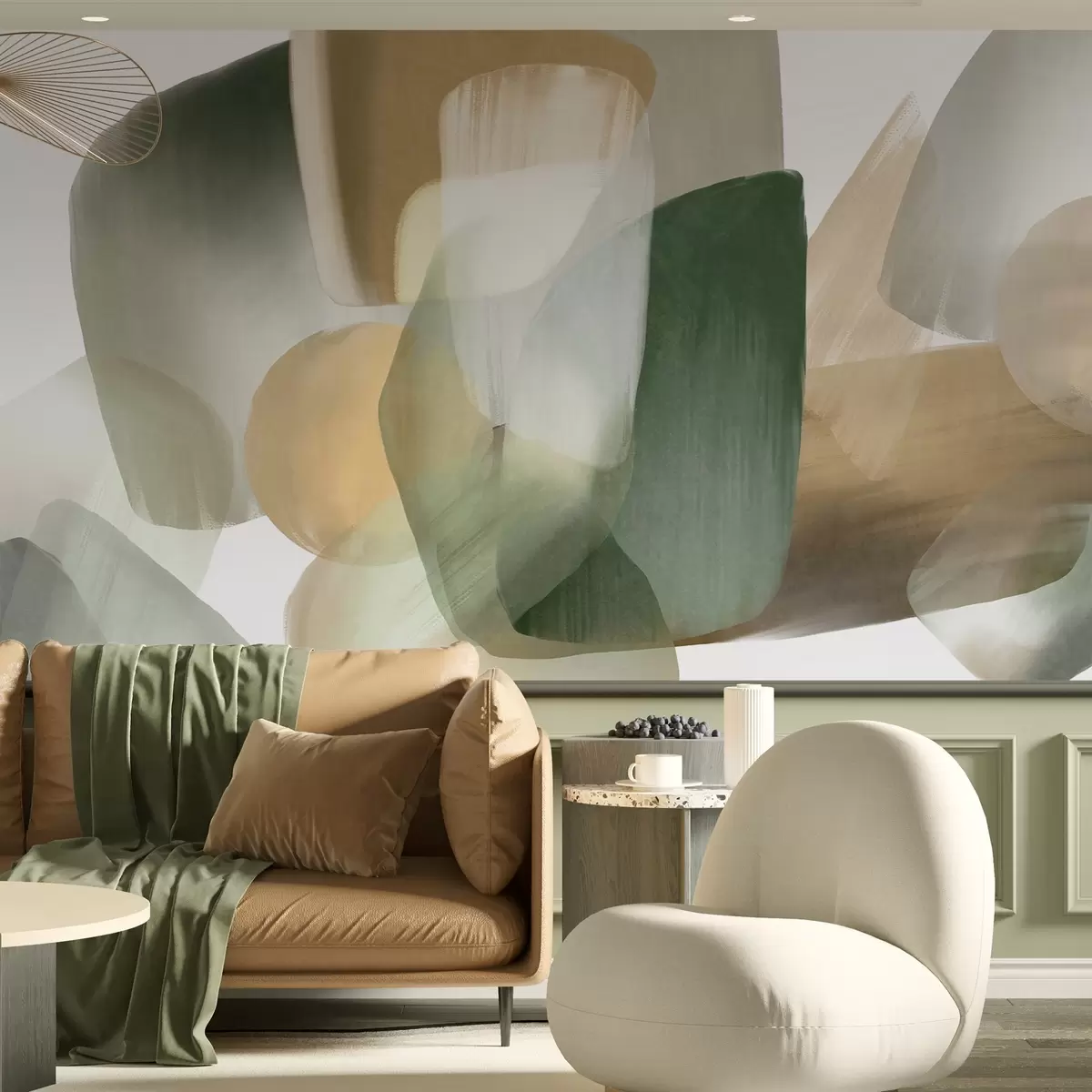 Fototapeten Abstrakte, strukturierte Formen in gedeckten Grün- und Beigetönen, mit weichen Kanten und überlappenden Schichten N° w09642