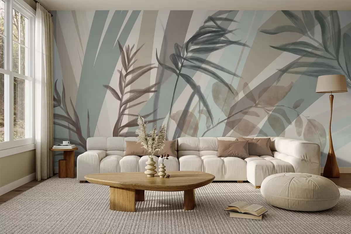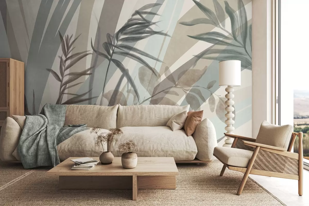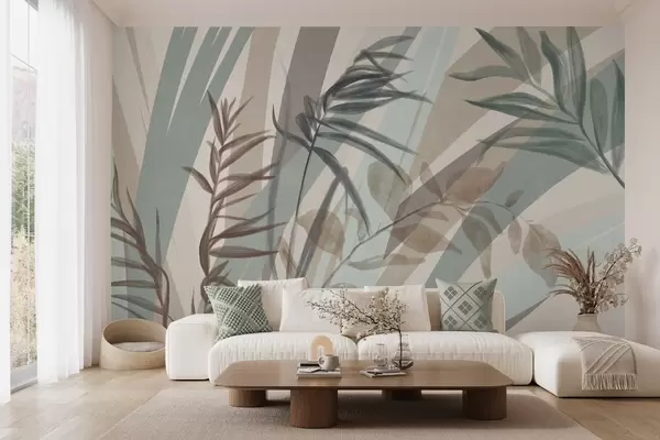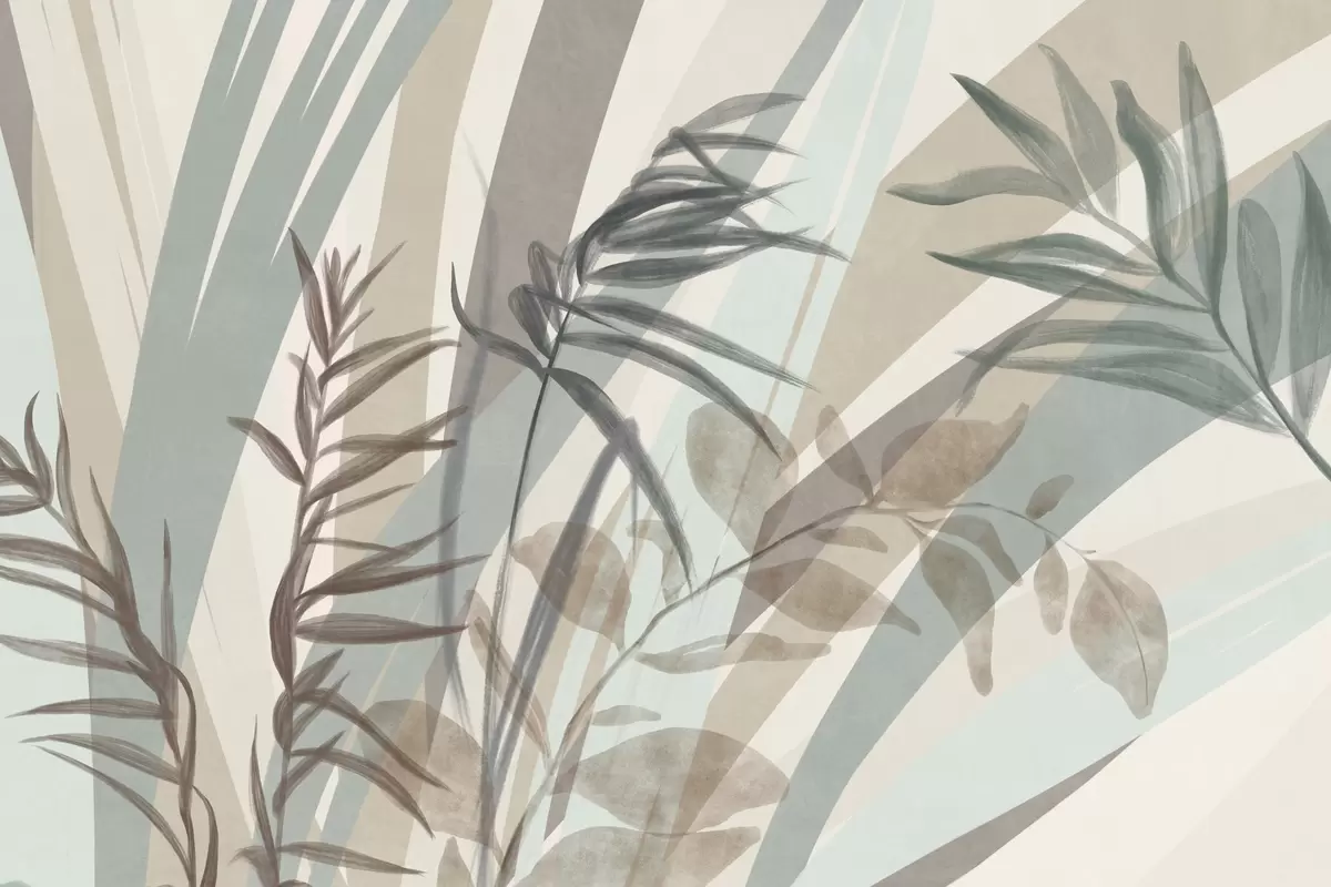 Fototapeten Hohes, strukturiertes Gras und Blätter in gedeckten Erdtönen, mit abstrakten Linien im Hintergrund, die einen organischen Druck ergeben. N° w09643