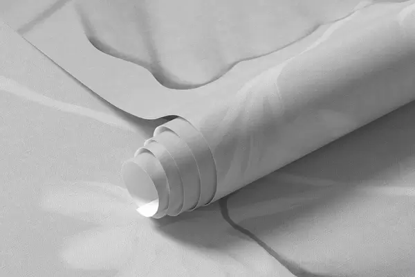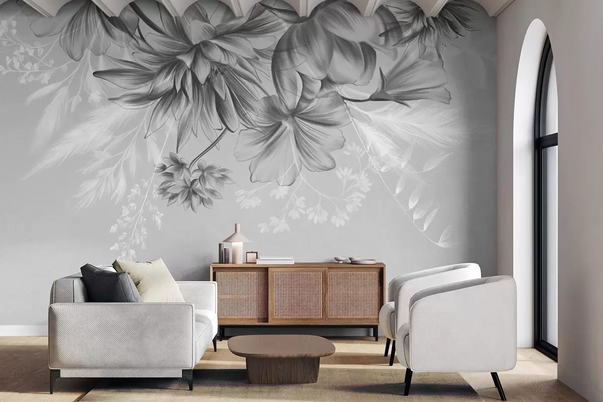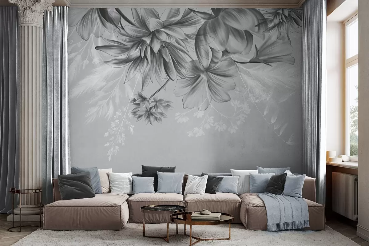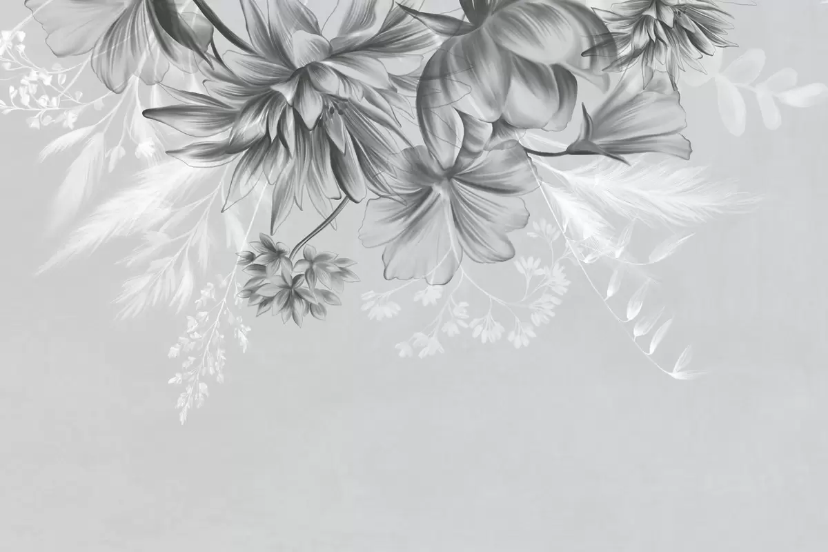 Fototapeten Strukturierte Blumen und Farne in Dunkelgrau- und Weißtönen vor einem gedeckten grauen Hintergrund im Zeichenstil N° w09644v1