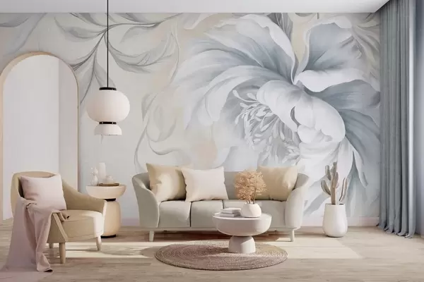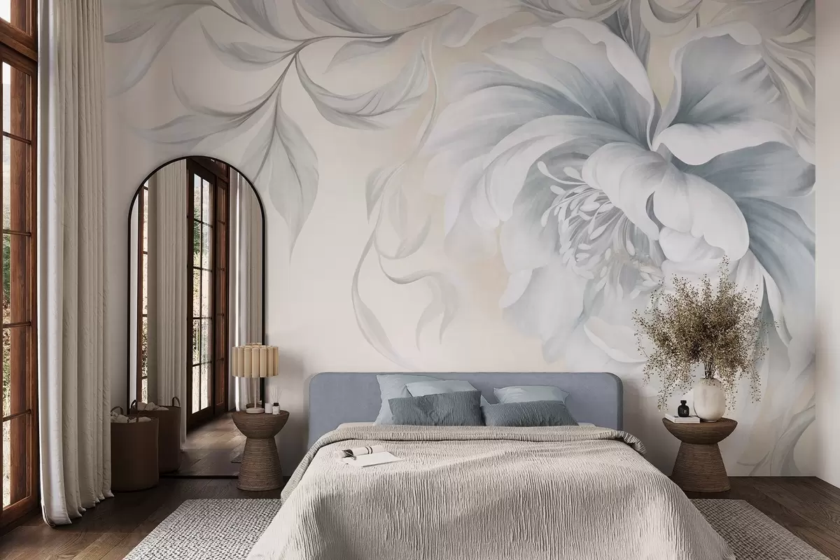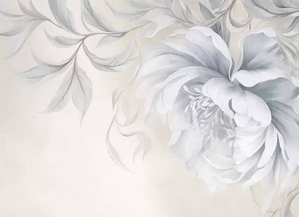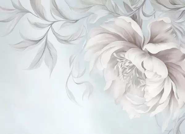 Fototapeten Große, strukturierte Pfingstrose mit zarten Blütenblättern und grauen Blättern, in sanftem Stil gemalt N° w09647