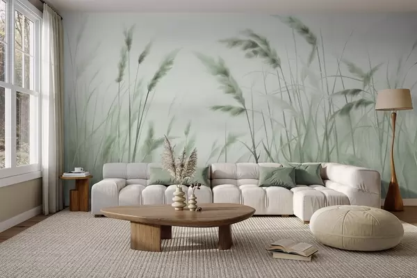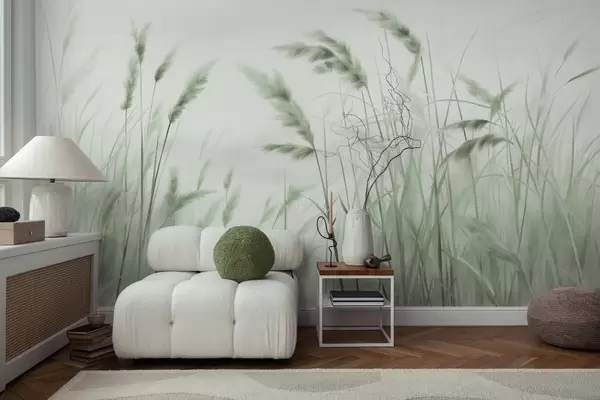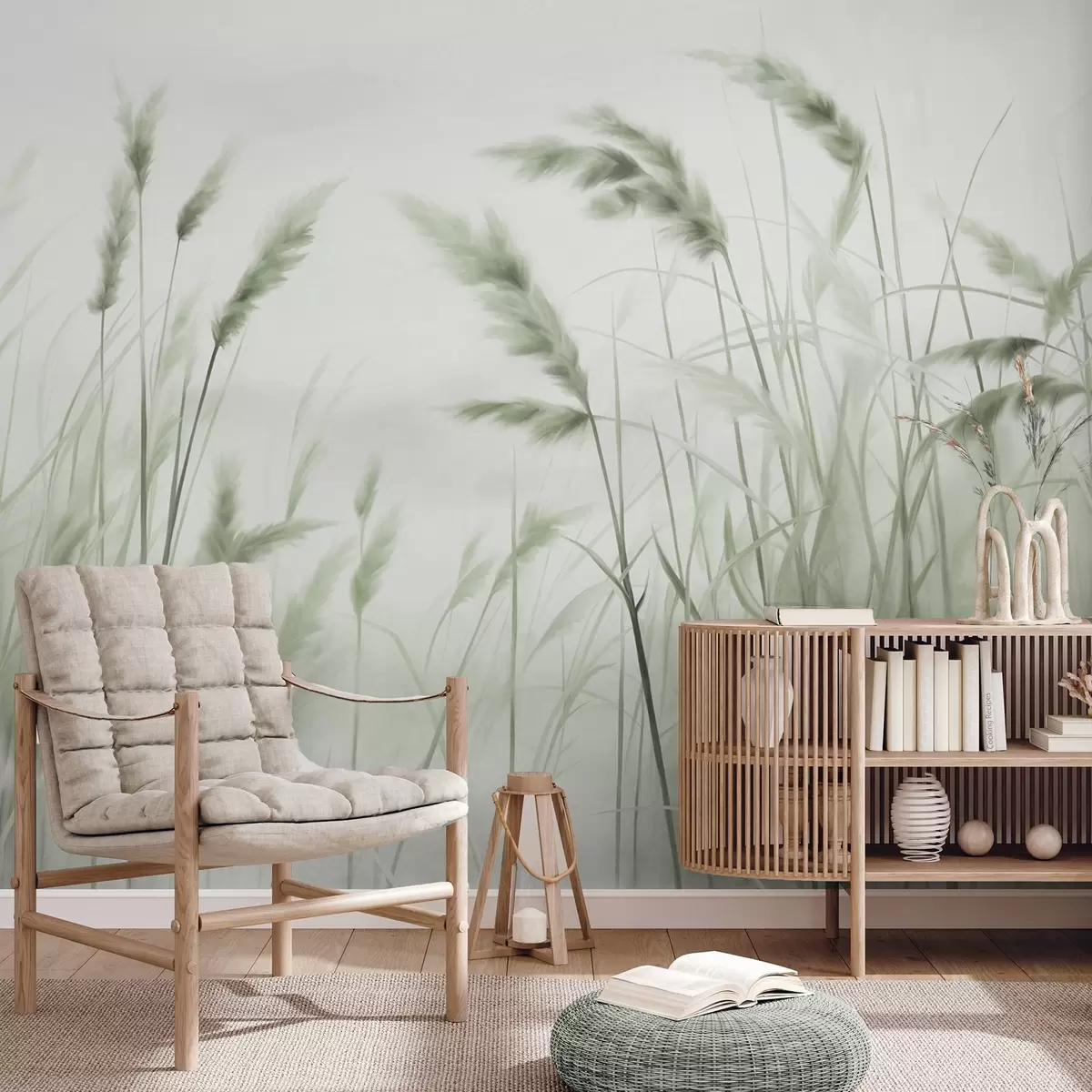 Fototapeten Hohes, strukturiertes trockenes Gras mit Weizenähren auf einem Feld vor einem weichen, blassen Hintergrund N° w09648v1