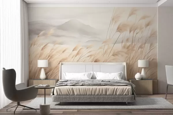 Fototapeten Strukturierte Berglandschaft mit hohem, trockenem Gras unter einem dunstigen Himmel N° w09649