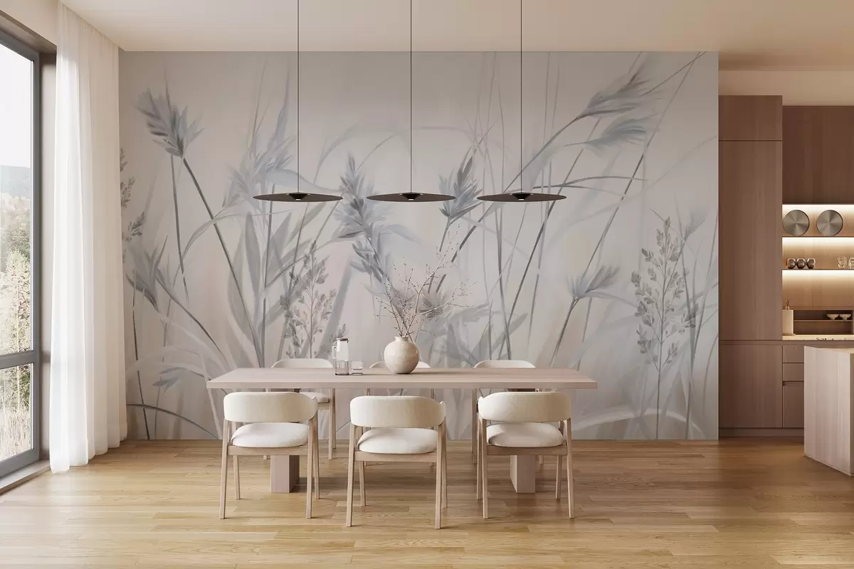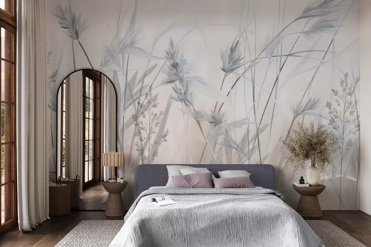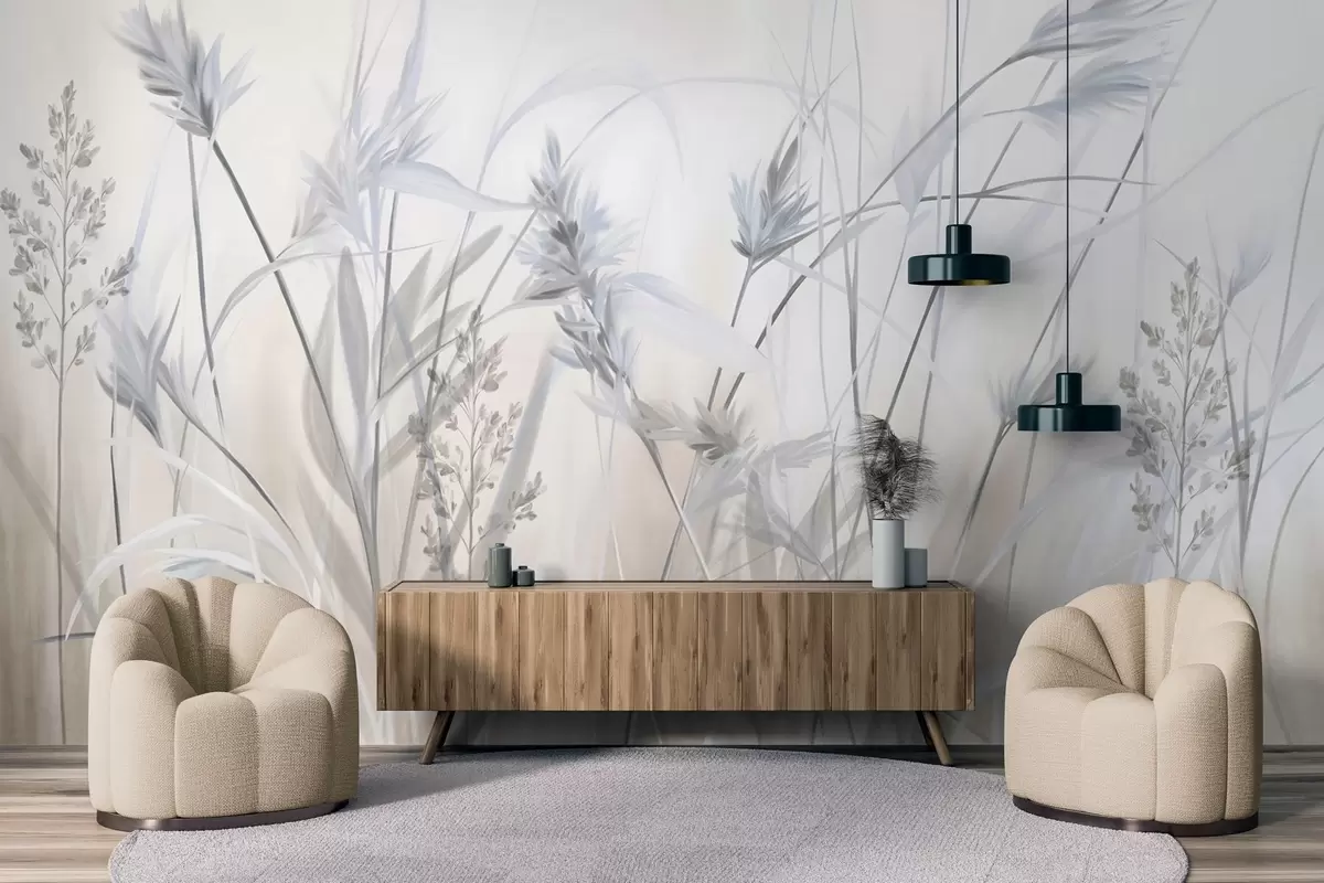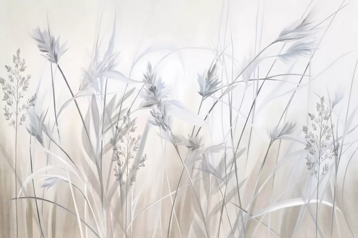 Fototapeten Hohe, trockene Grashalme mit federartigen Spitzen in gedeckten Farbtönen, weicher, verschwommener weißer und beiger Hintergrund N° w09652v1