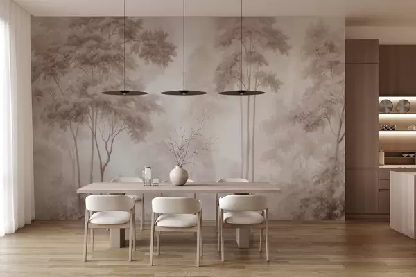 Fototapeten Abstrakte Waldlandschaft in rauchigen Beigetönen mit einer gewissen Tiefenwirkung N° w09657