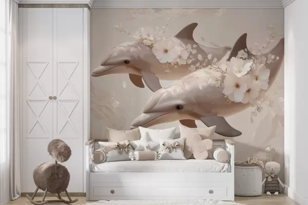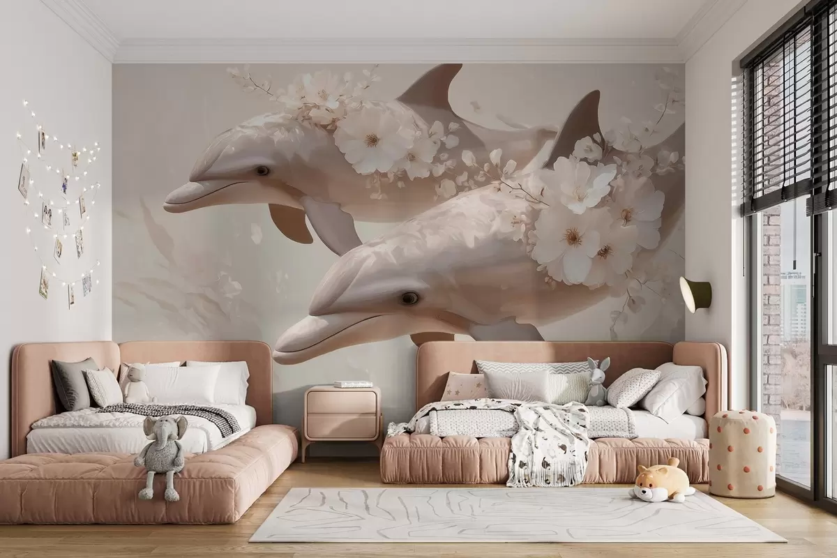 Fototapeten Delfine in einem Meer aus zarten Blumen und sanftem Licht N° w09666