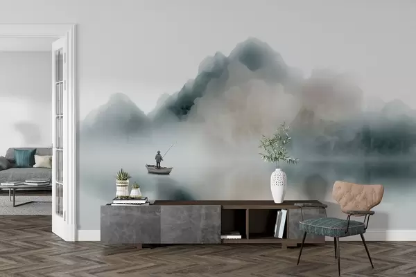 Fototapeten Berglandschaft mit einem Boot und einem Fischer, die sich in sanften Nebel auflösen N° w09678