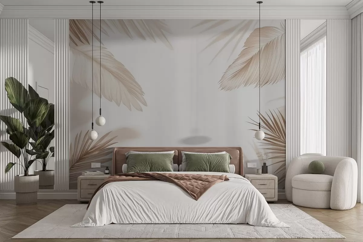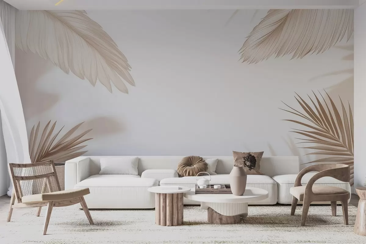 Fototapeten Beiges tropisches Dekor mit Palmenblatt-Silhouetten und sanften Schatten N° w09714