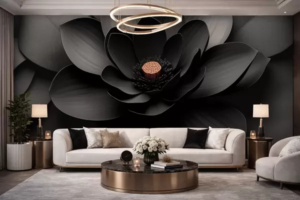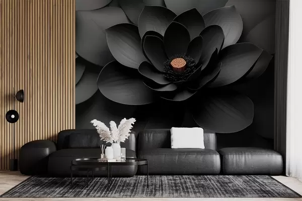 Fototapete Minimalistische schwarze Blume mit Blütenblättern und einem kontrastierenden, warmen Blütenkern w09721