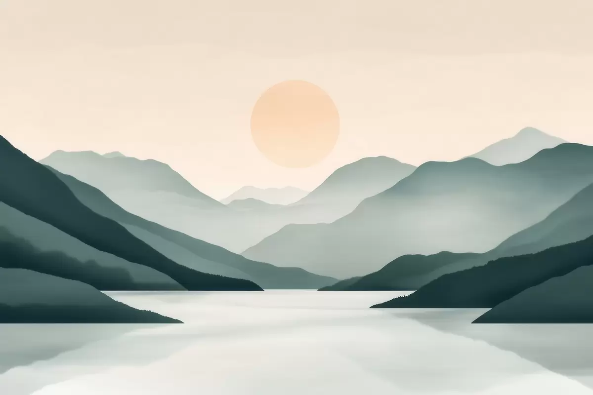 Fototapeten Ruhige Berglandschaft mit Sonne über dem See N° w09735
