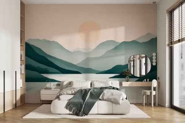 Fototapeten Ruhige Berglandschaft mit Sonne über dem See N° w09735