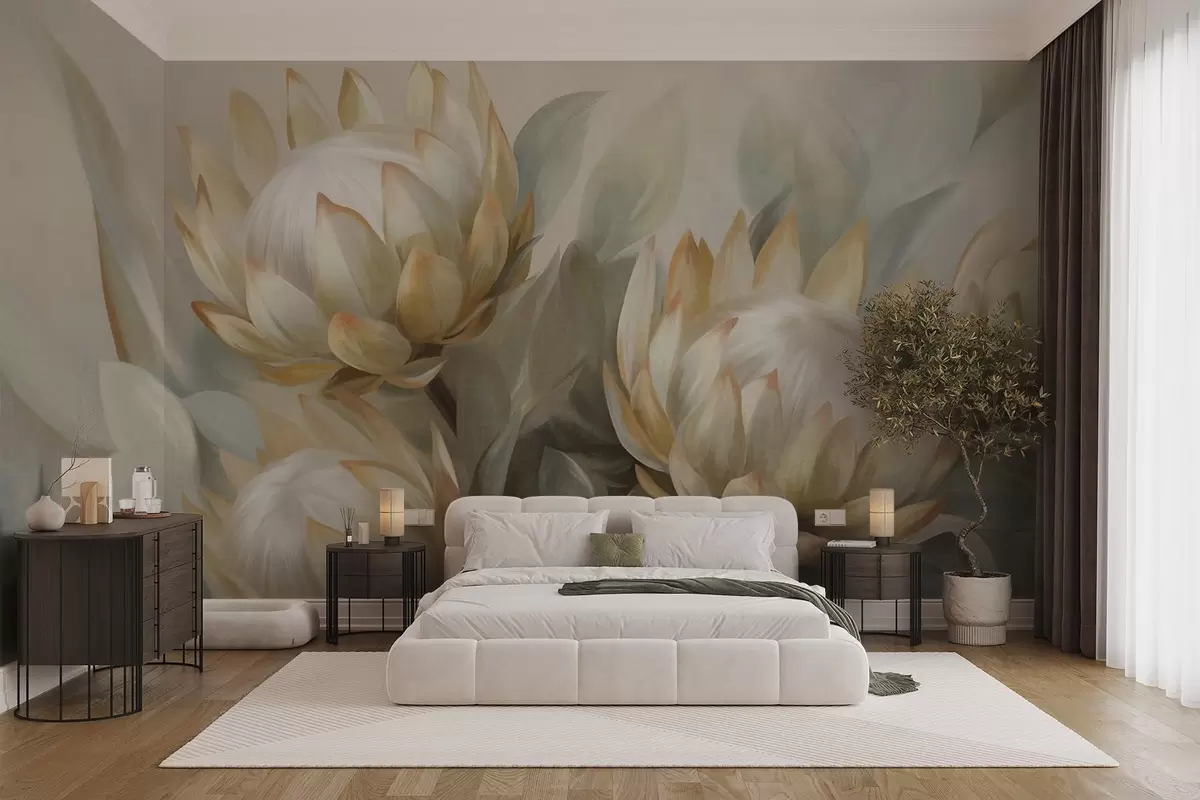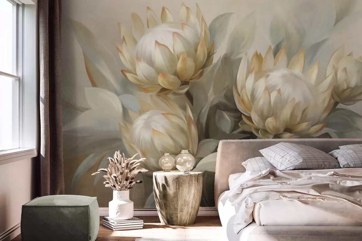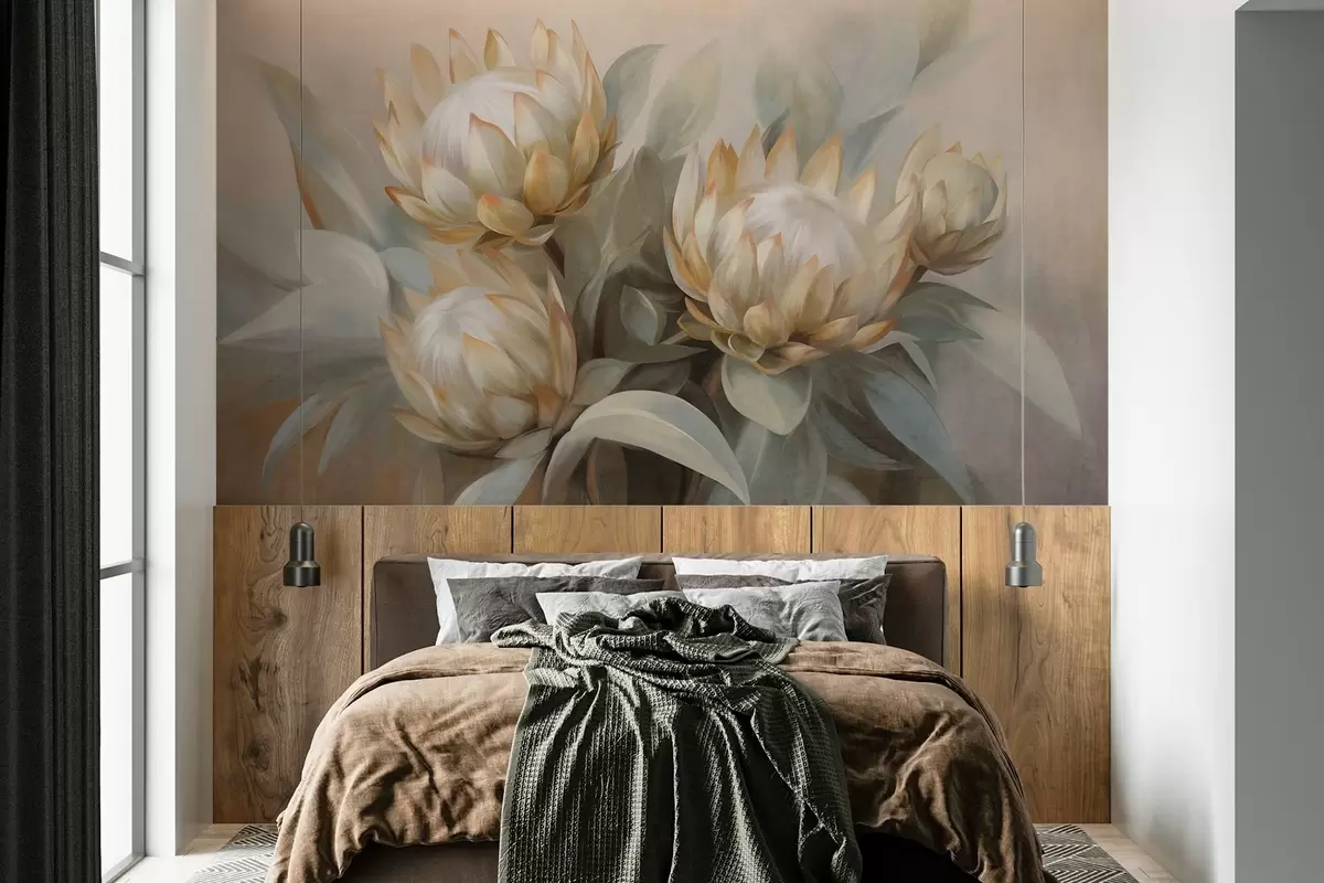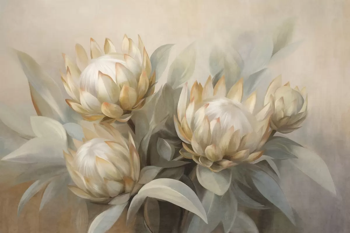 Fototapeten Strukturierte Protea-Blüten mit grünen Blättern und einem weichen, unscharfen Hintergrund N° w09738