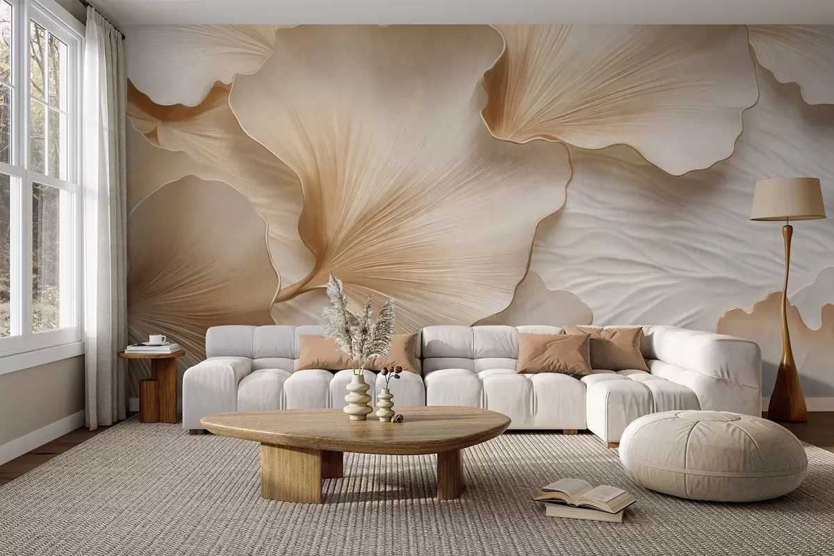 Fototapeten Strukturierte, beige und weiße Ginkgoblätter mit zartem Bio-Print N° w09741
