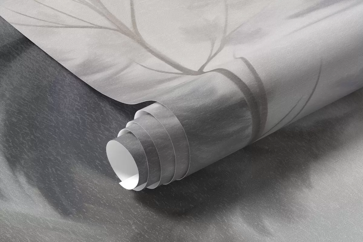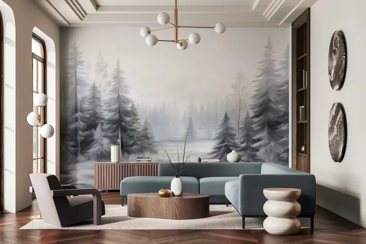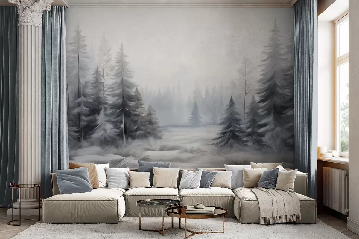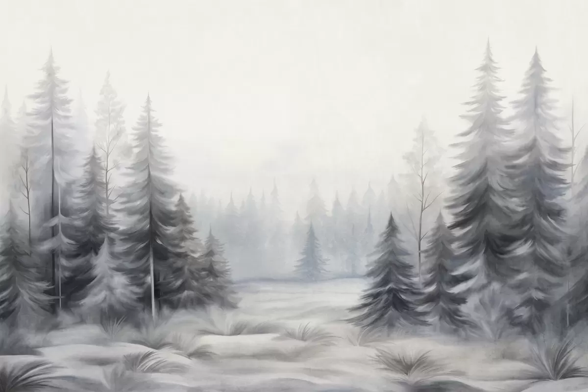 Fototapeten Strukturierte Winterwaldbäume im Nebel, in gedämpften Grau- und Weißtönen N° w09745