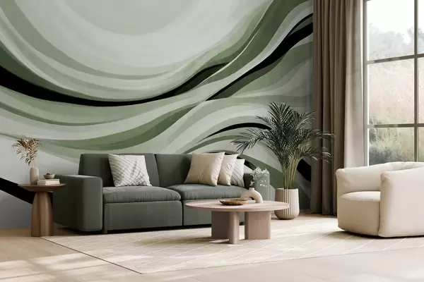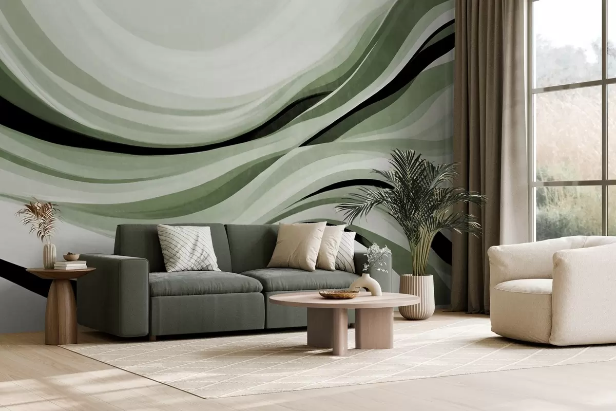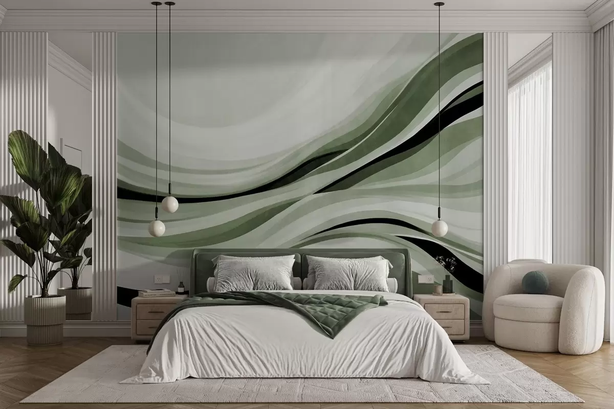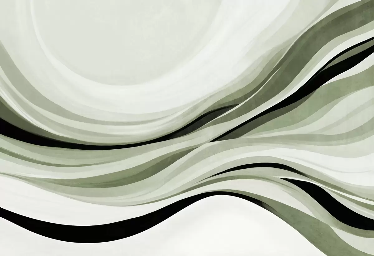 Fototapeten Abstrakte Wellenlinien in Grün- und Schwarztönen vor hellem Hintergrund, strukturierte Kunst N° w09748v1