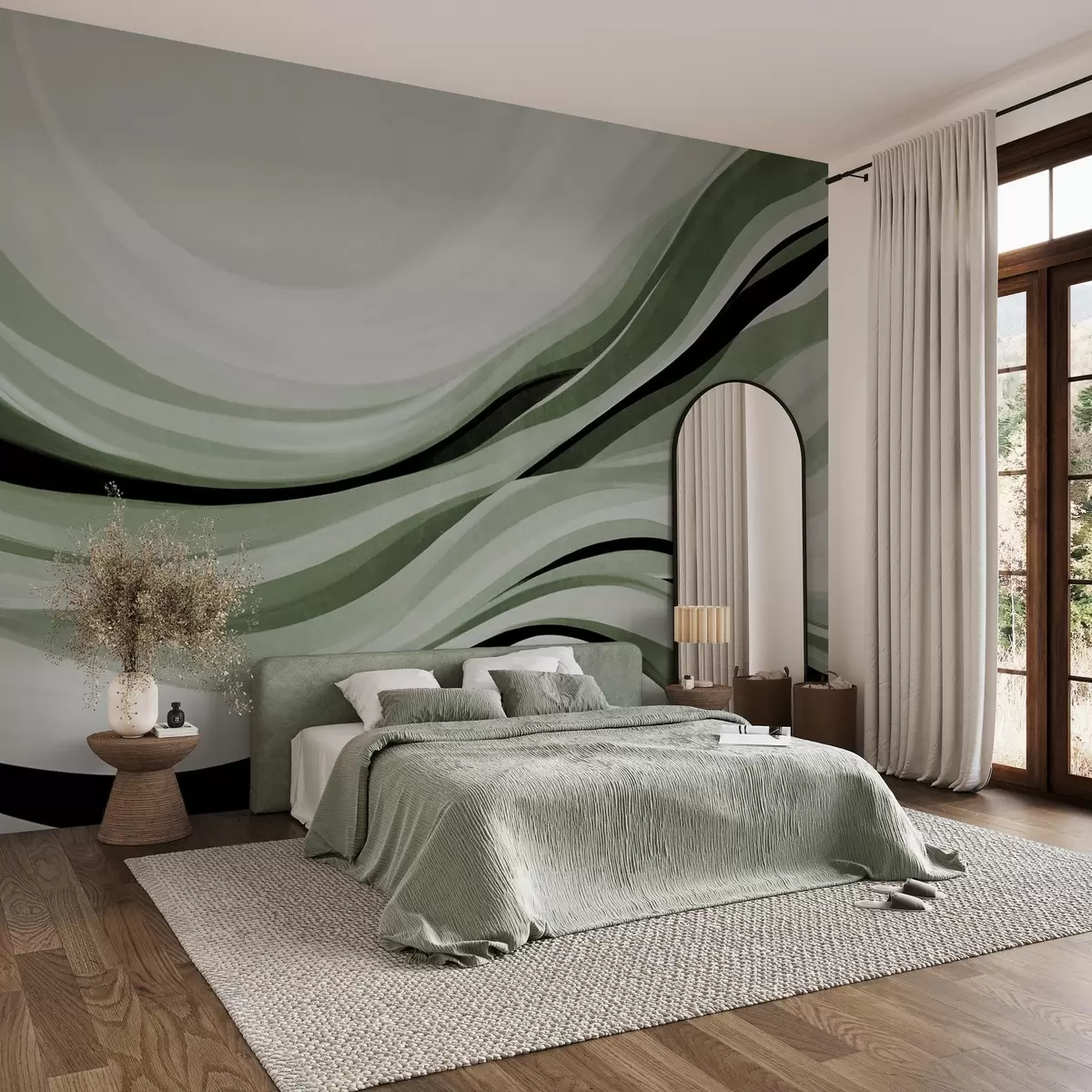 Fototapeten Abstrakte Wellenlinien in Grün- und Schwarztönen vor hellem Hintergrund, strukturierte Kunst N° w09748v1