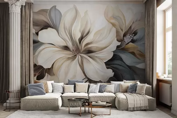 Fototapeten Große, cremefarbene Magnolienblüten mit braunen und grauen Blättern, sanfte Beleuchtung, abstrakter Hintergrund N° w09749