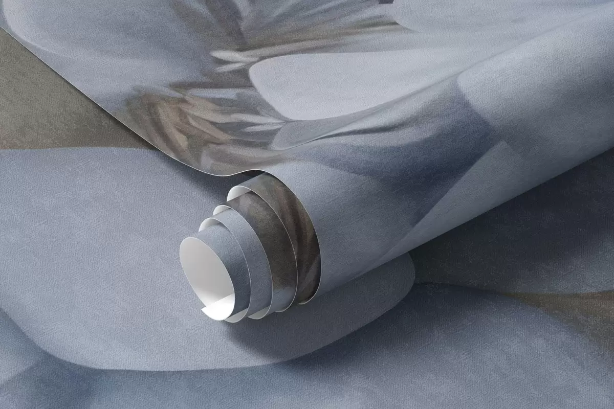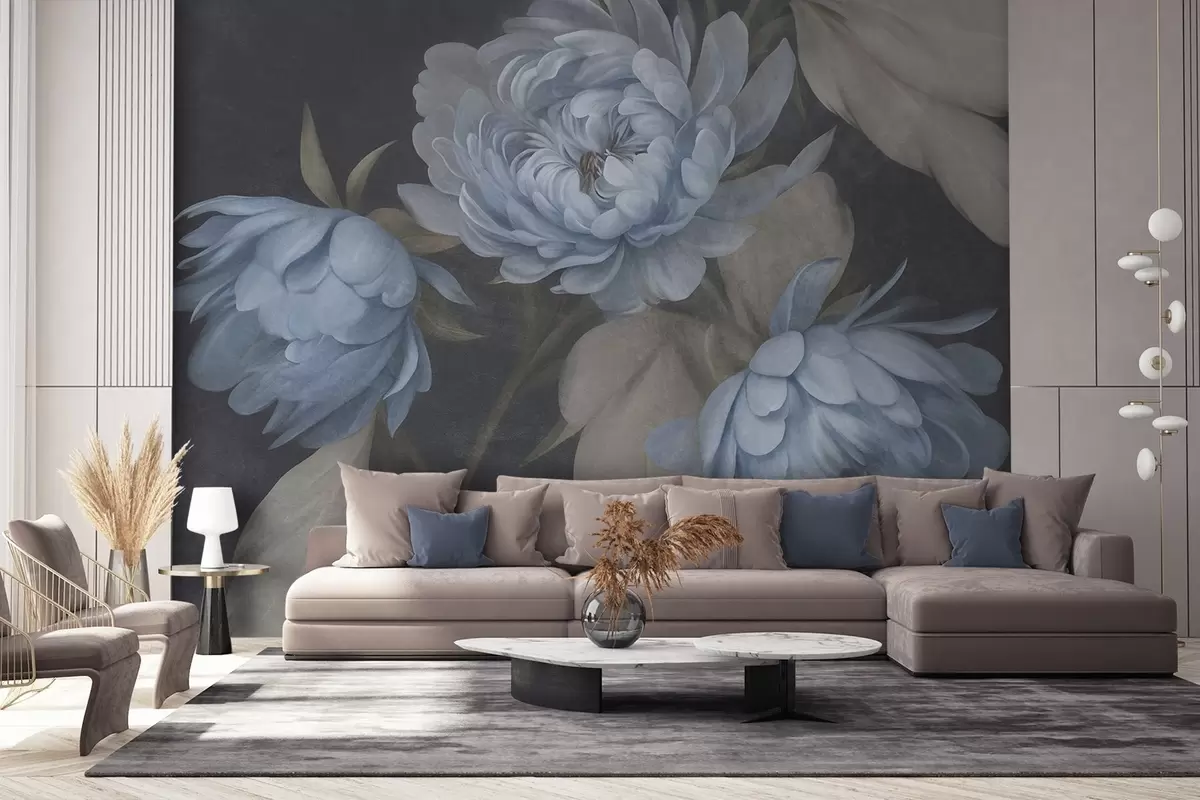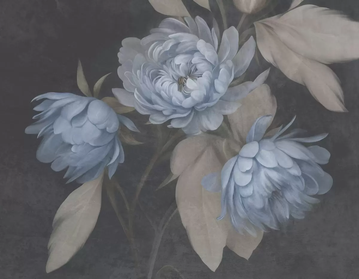 Fototapeten Strukturierte hellblaue Pfingstrosenblüten mit beigen Blättern vor einem dunklen Hintergrund N° w09751