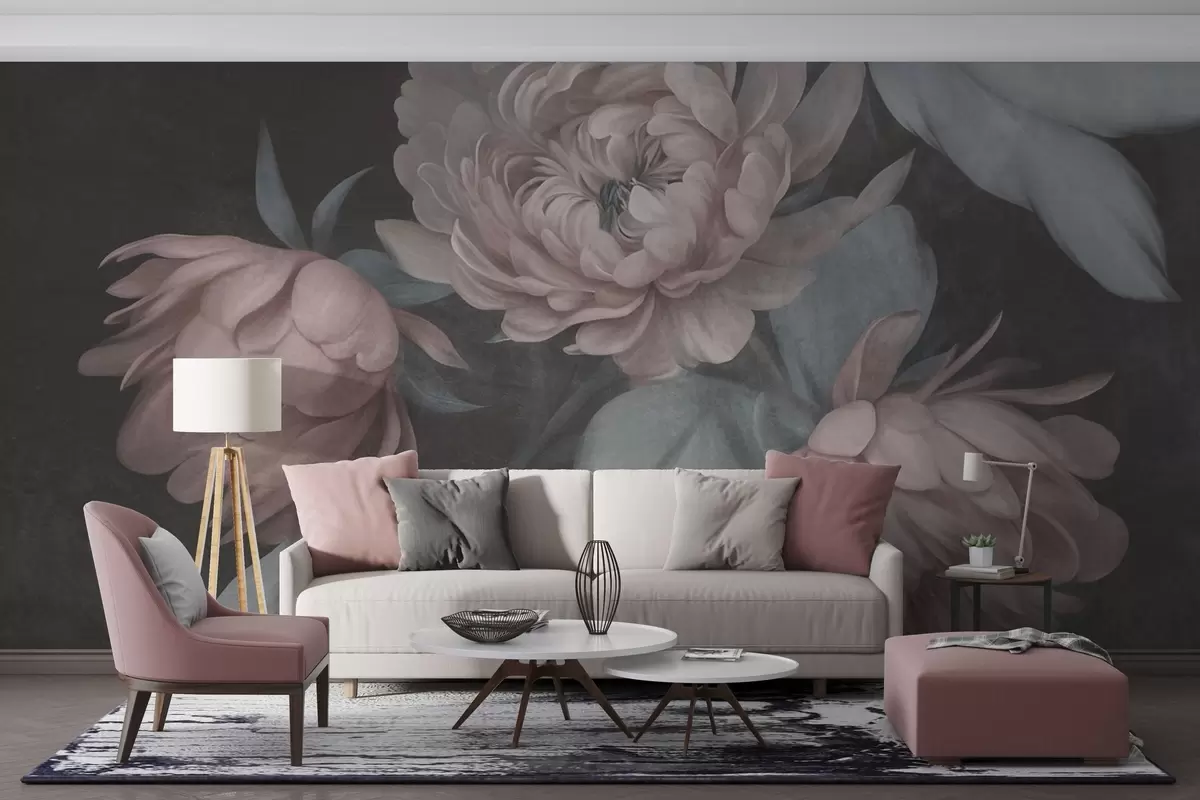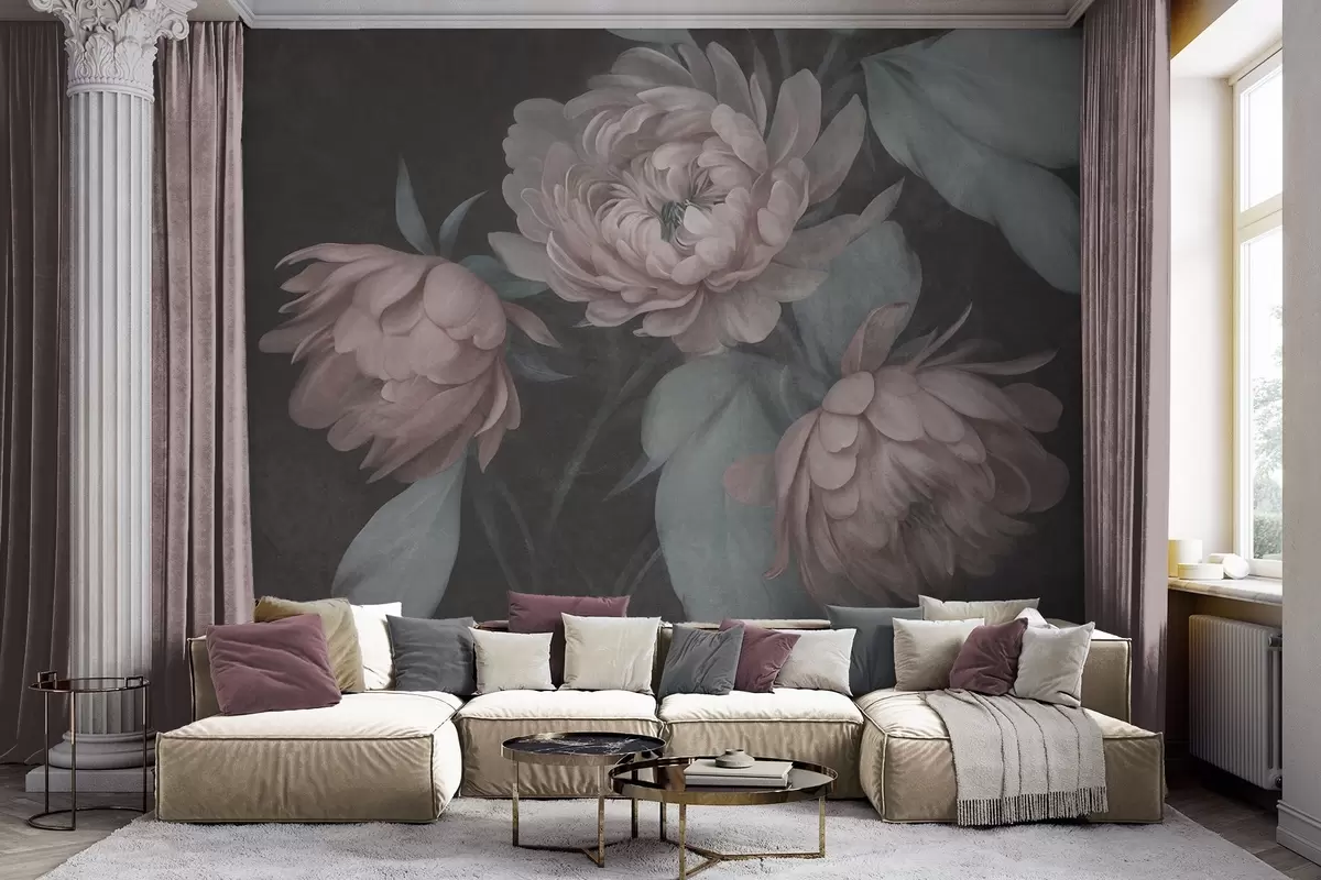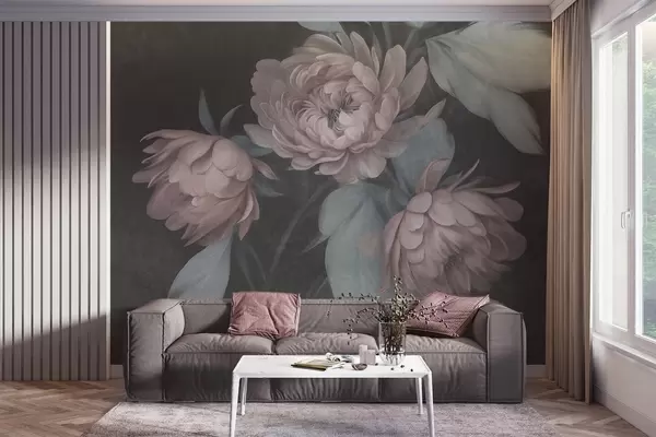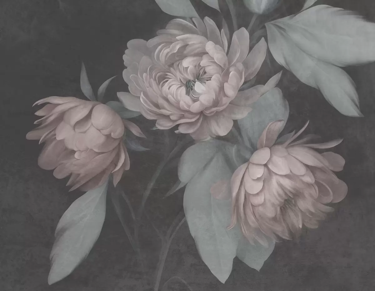 Fototapeten Strukturierte hellrosa Pfingstrosenblüten mit zartgrünen Blättern vor einem dunklen Hintergrund N° w09751v1