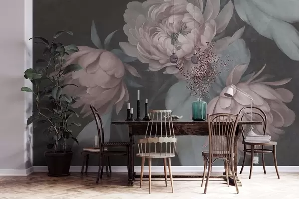 Fototapeten Strukturierte hellrosa Pfingstrosenblüten mit zartgrünen Blättern vor einem dunklen Hintergrund N° w09751v1