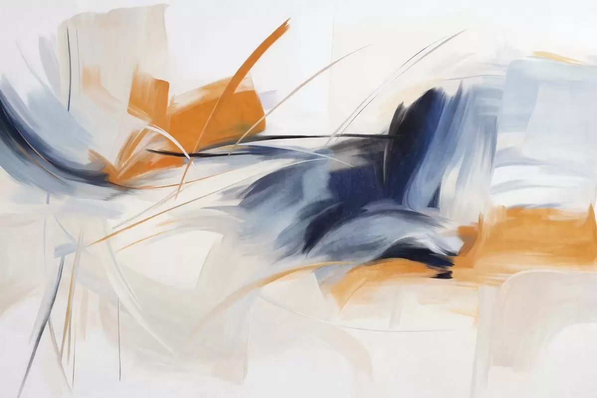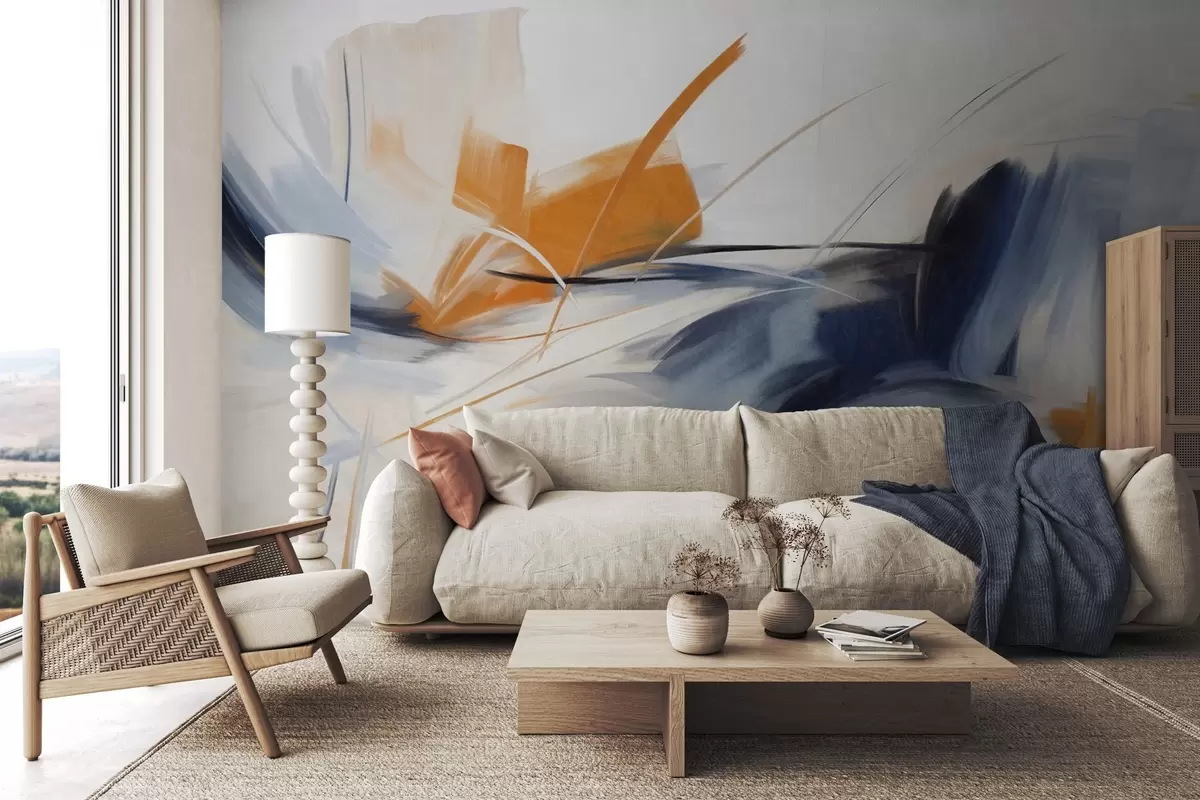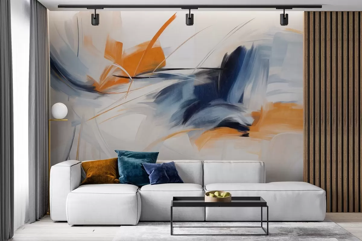 Fototapeten Abstrakter Malstil mit orangefarbenen und blauen strukturierten Pinselstrichen N° w09755