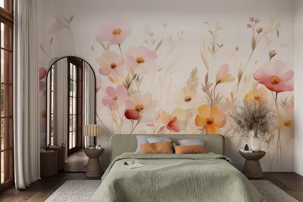 Fototapeten Abstraktes Feld mit Wildblumen in Pastelltönen, Aquarellmalerei N° w09757