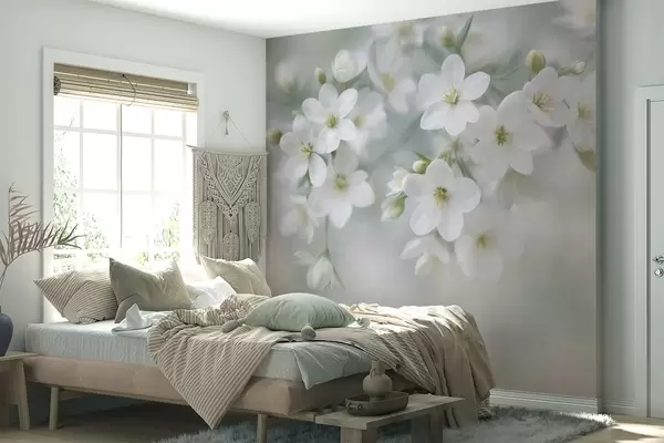 Fototapeten Zarte, strukturierte weiße Blüten, die im Hintergrund sanft verschwimmen N° w09759