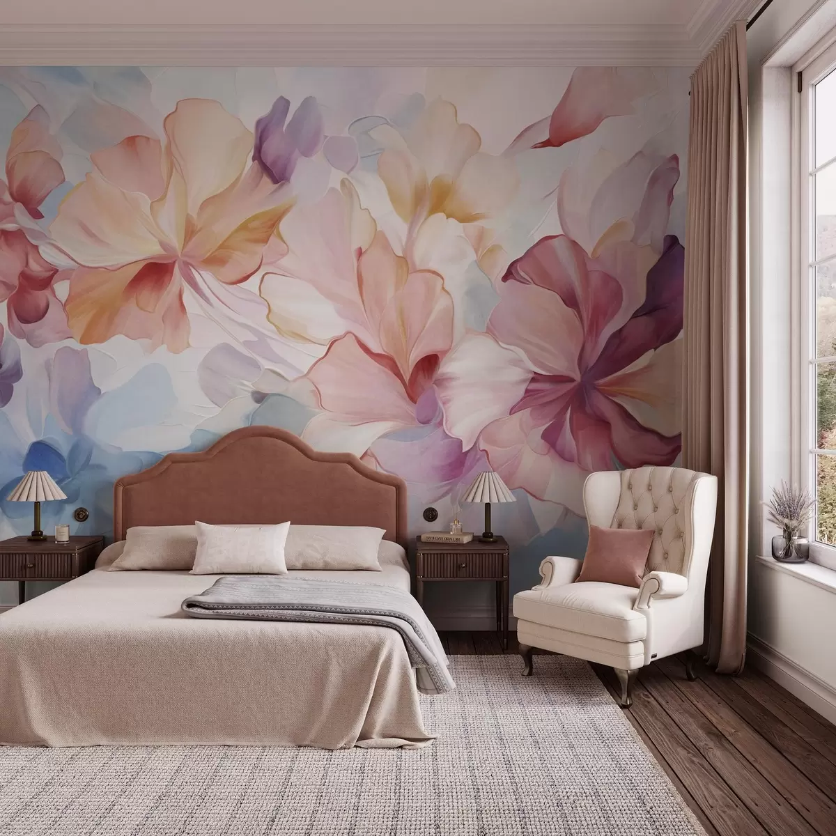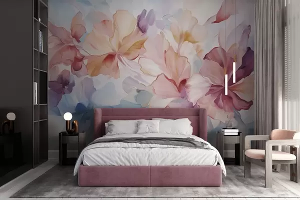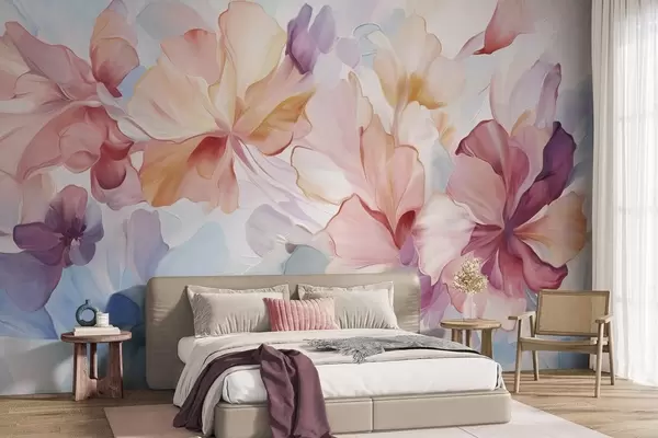 Fototapeten Abstrakte Fantasieblumen in Rosa-, Pfirsich- und Lavendeltönen im Malstil, strukturierte Kunst N° w09767
