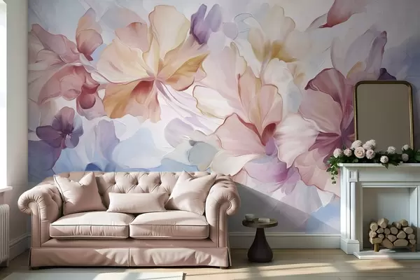 Fototapeten Abstrakte Fantasieblumen in Rosa-, Pfirsich- und Lavendeltönen im Malstil, strukturierte Kunst N° w09767