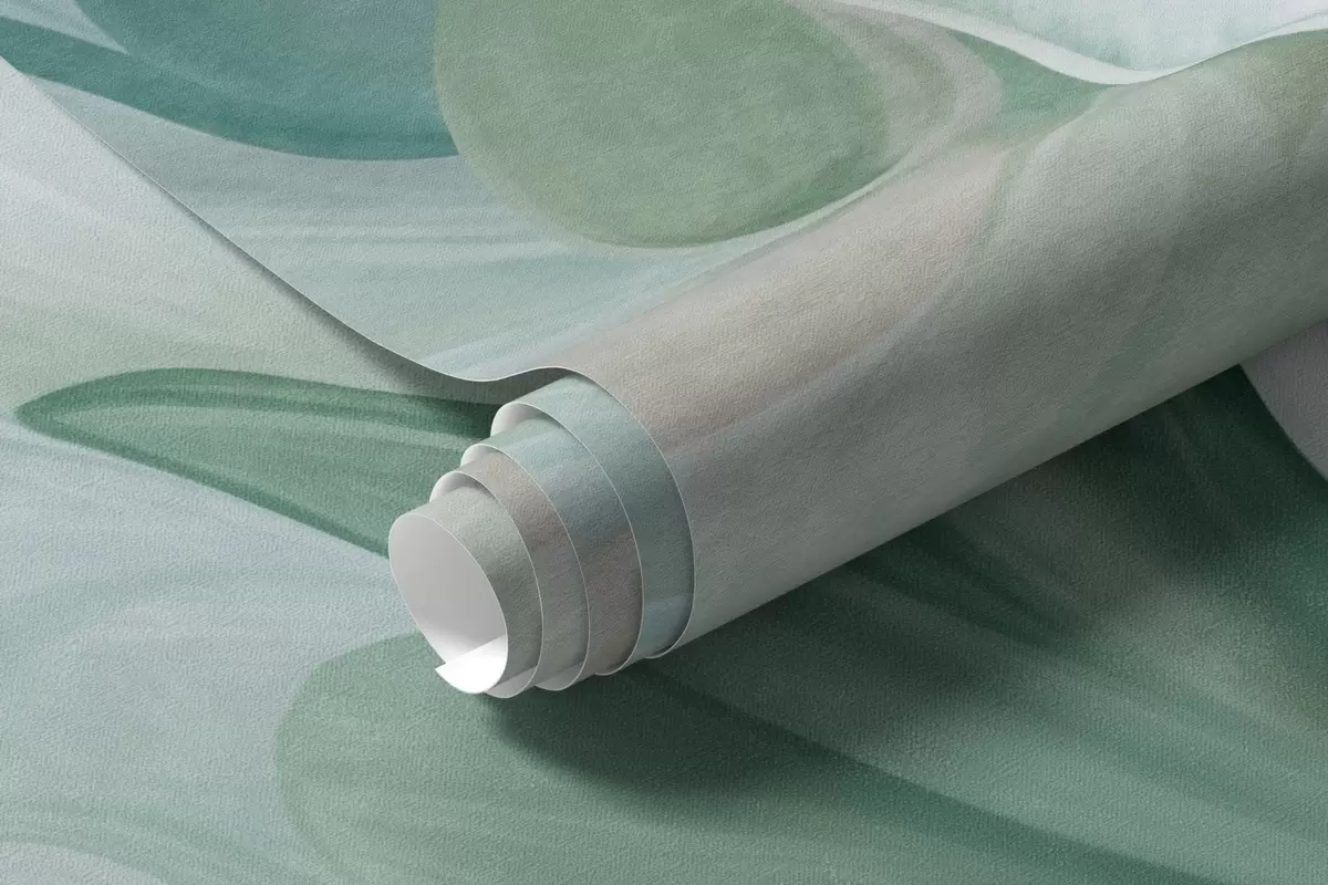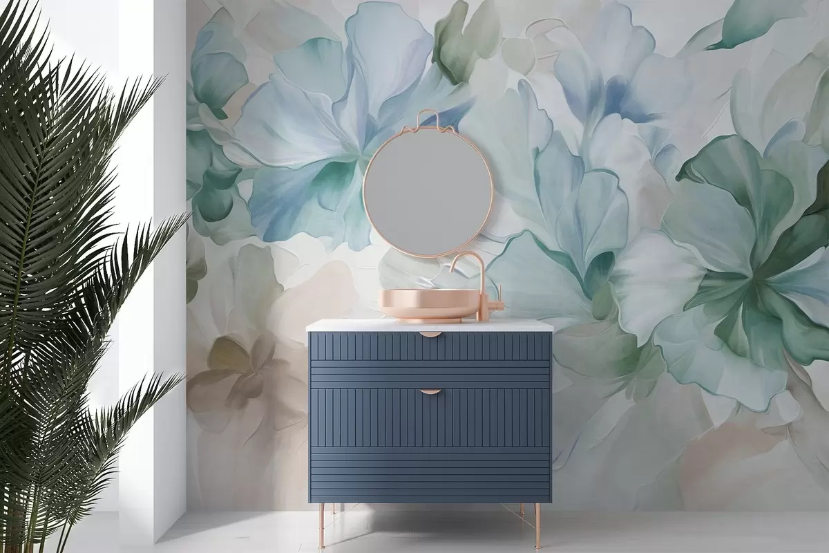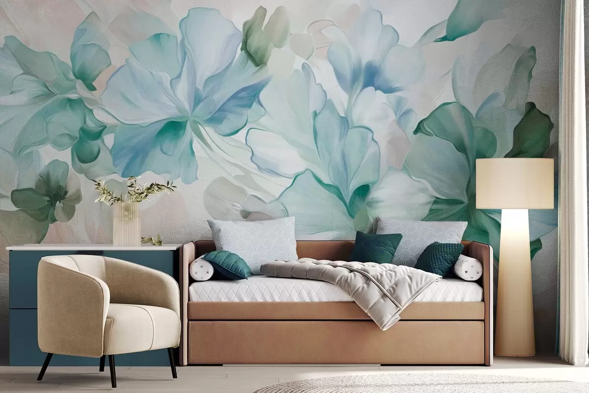 Fototapeten Abstrakte Fantasieblumen in Grün-, Blau- und Beigetönen im Malstil, strukturierte Kunst N° w09767v1
