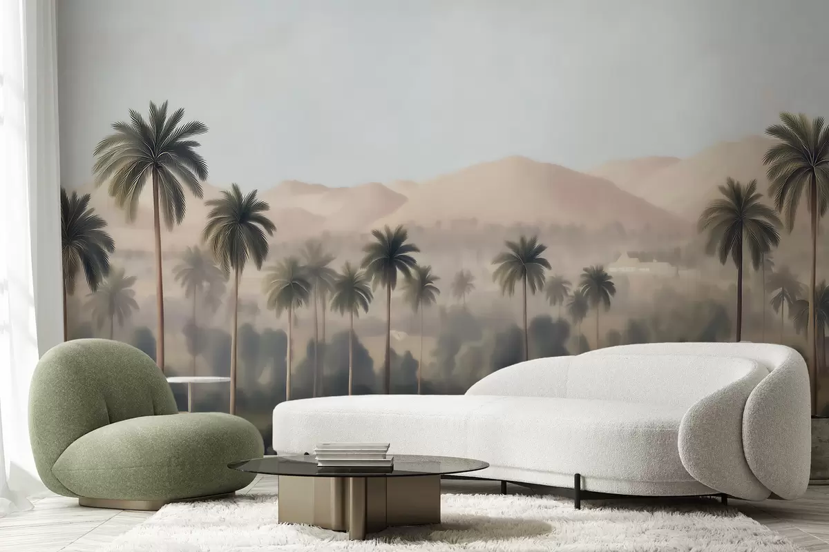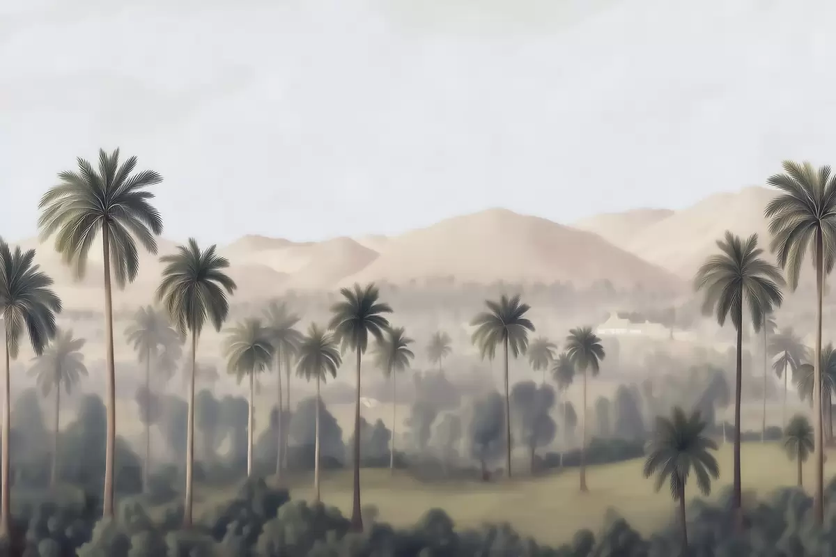 Fototapeten Tropische Landschaft mit Palmen und Bergen, Vintage-Panorama in Beige- und Grüntönen N° w09798