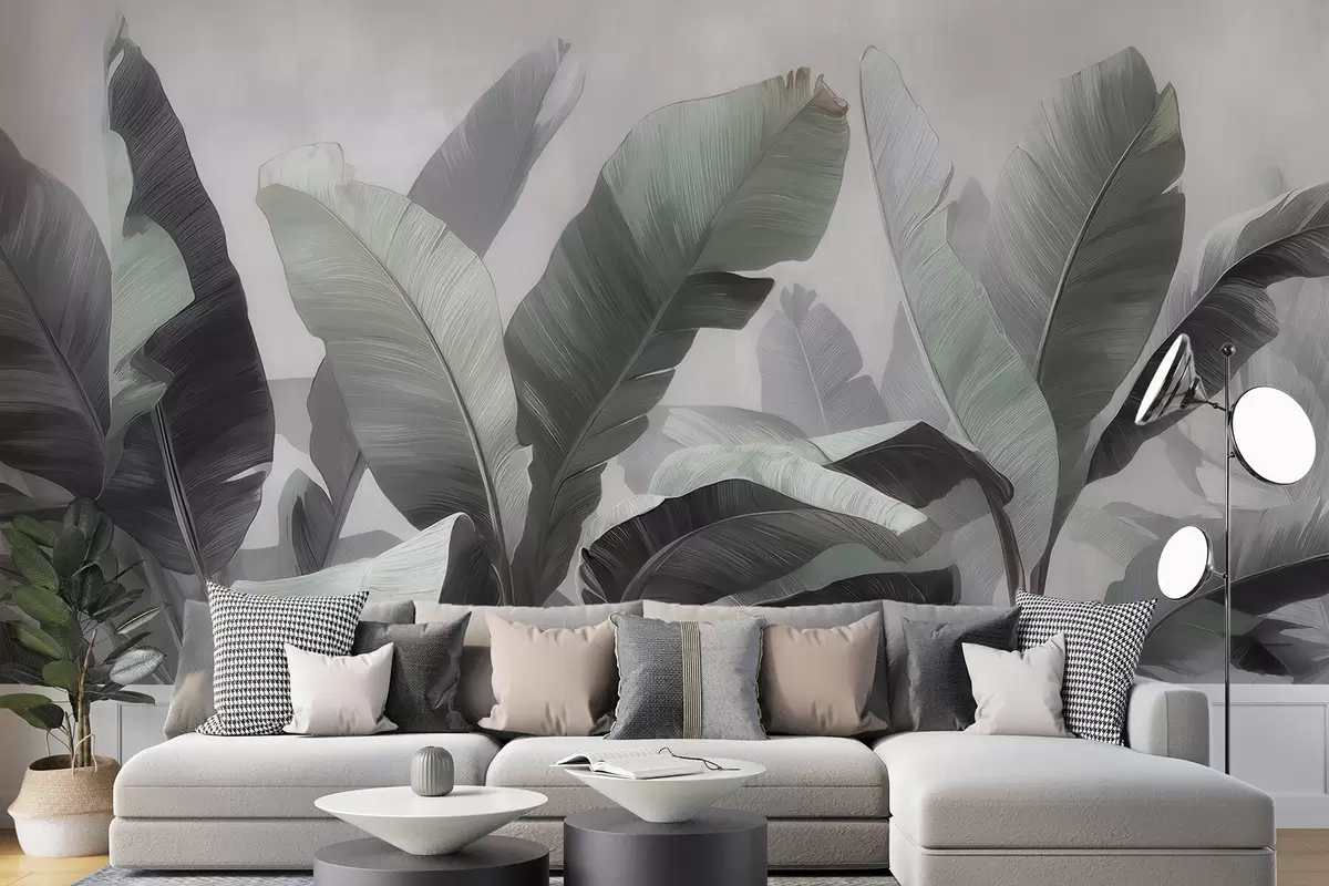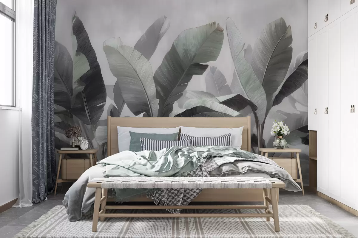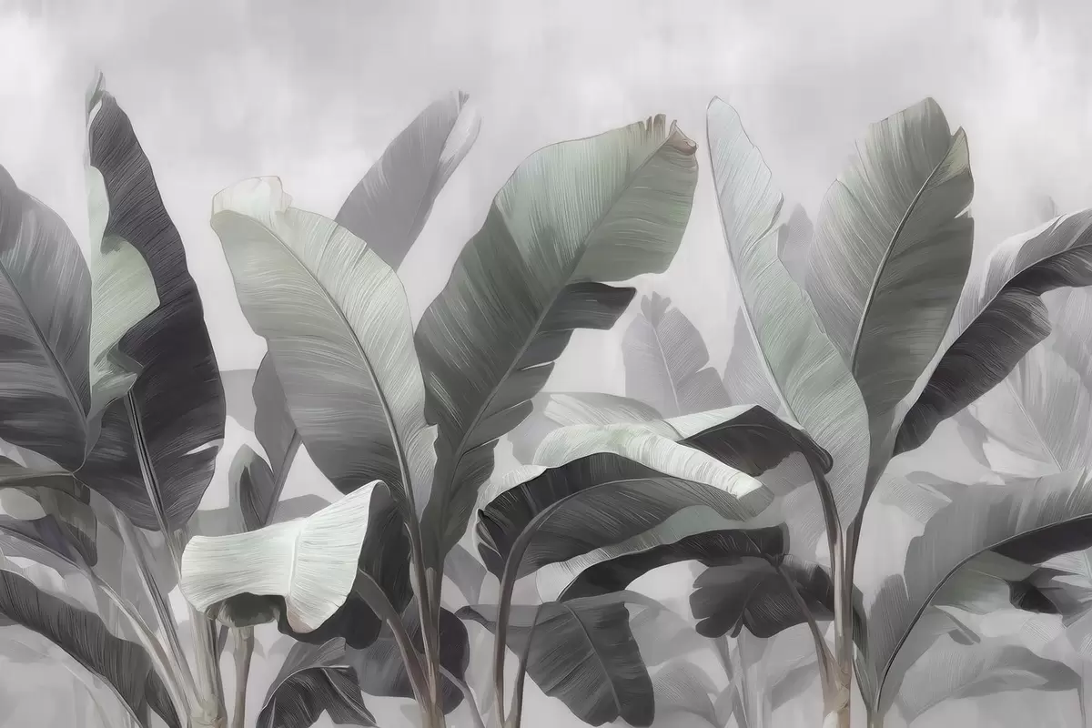 Fototapeten Abstrakte, tropisch anmutende große Bananenblätter in einer neutralen Farbpalette mit sanften Graugrüntönen N° w09805
