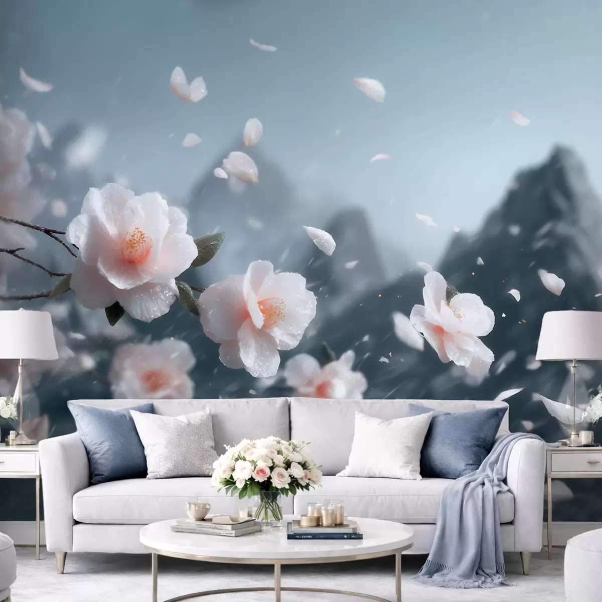 Fototapeten Zarte Kirschblüten vor einer Bergkulisse, stimmungsvolle japanische Landschaft in Pastelltönen N° w09808