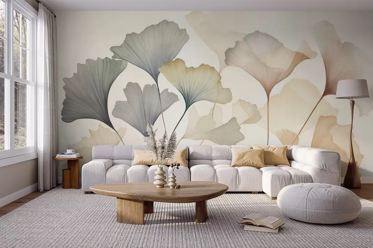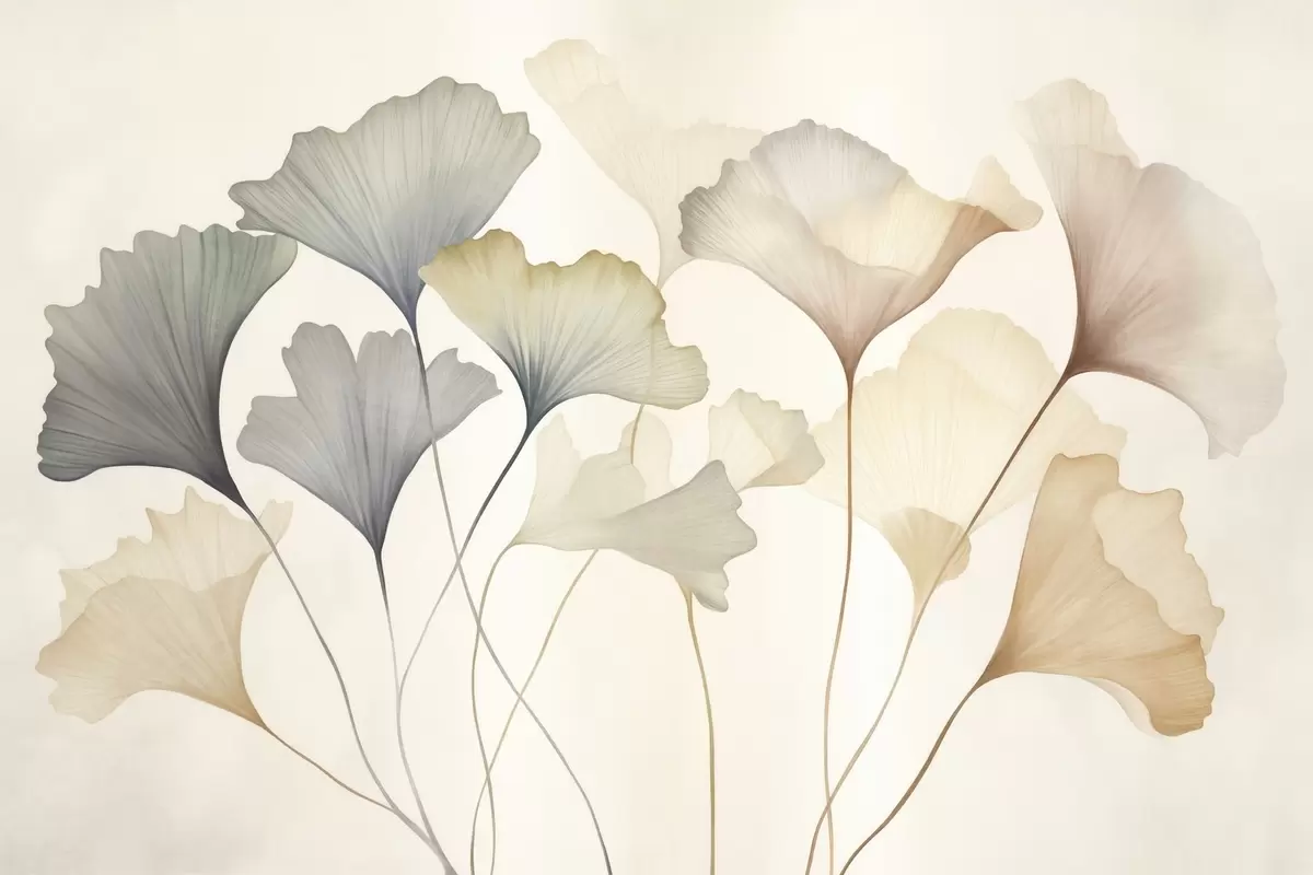 Fototapeten Abstrakte Ginkgoblätter in gedeckten Pastelltönen wie Blau, Grün und Pfirsich, strukturierte Kunst N° w09810
