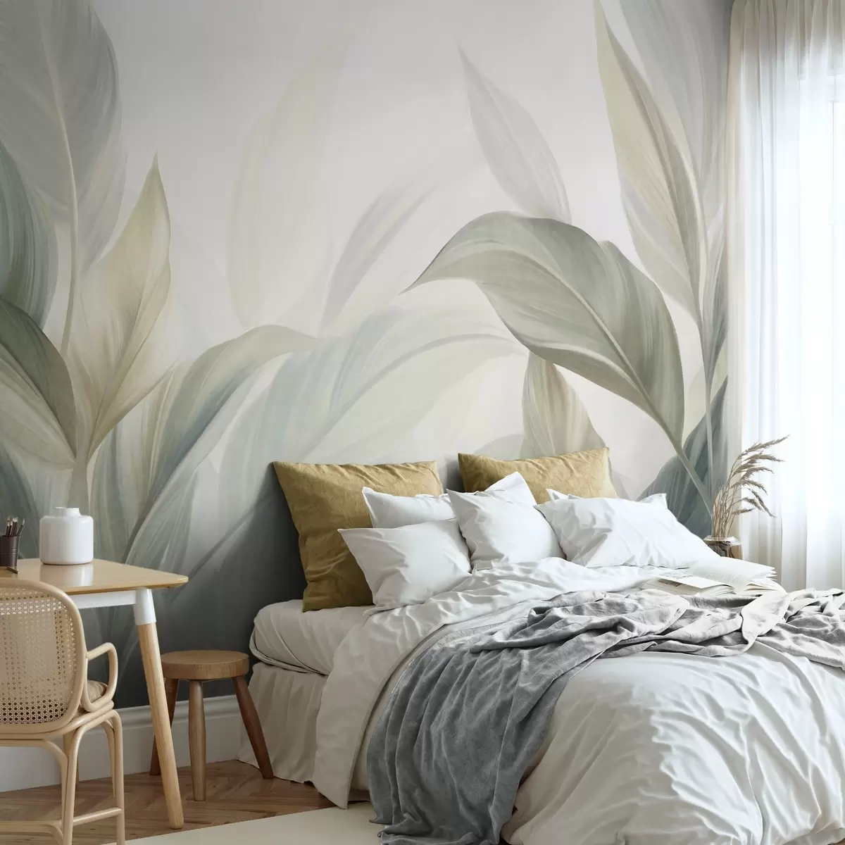 Fototapeten Große, hellgrüne tropische Blätter in sanften Pastelltönen, strukturierte Kunst N° w09816