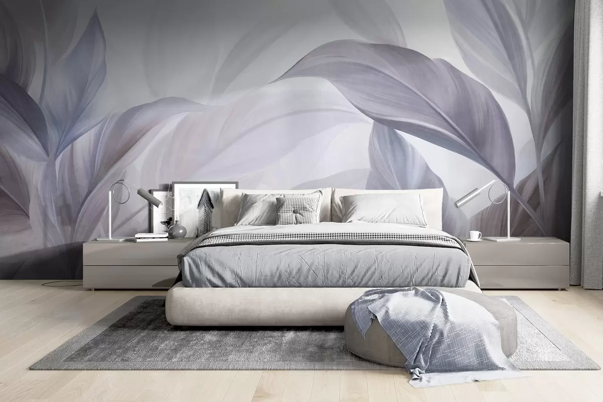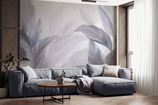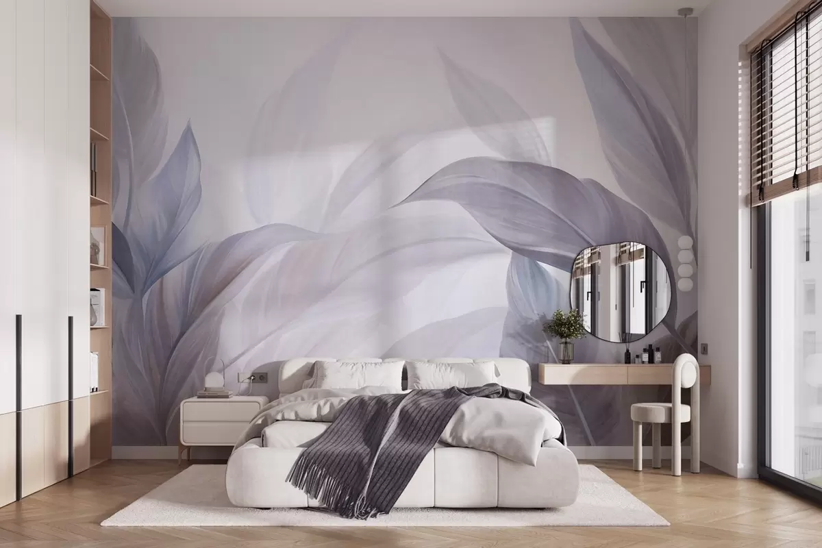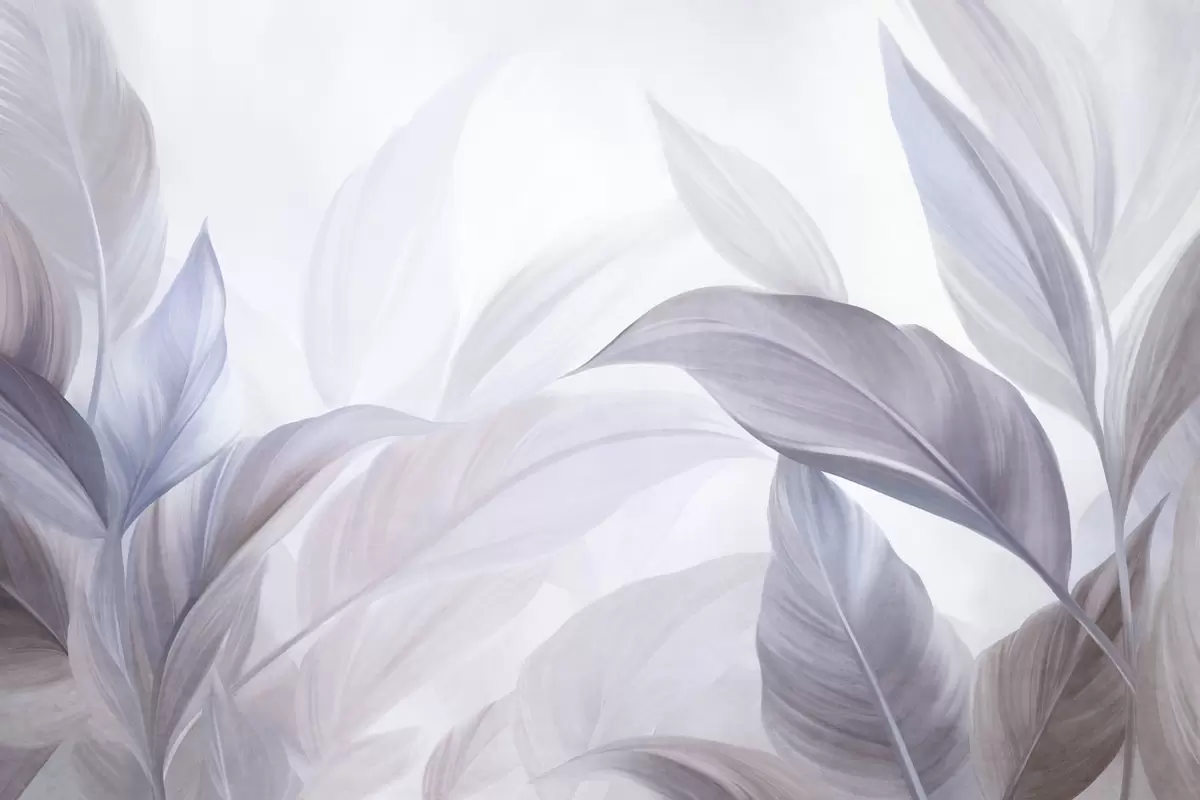 Fototapeten Große, hellblaue und violette tropische Blätter in sanften Pastelltönen, strukturierte Kunst N° w09816v1