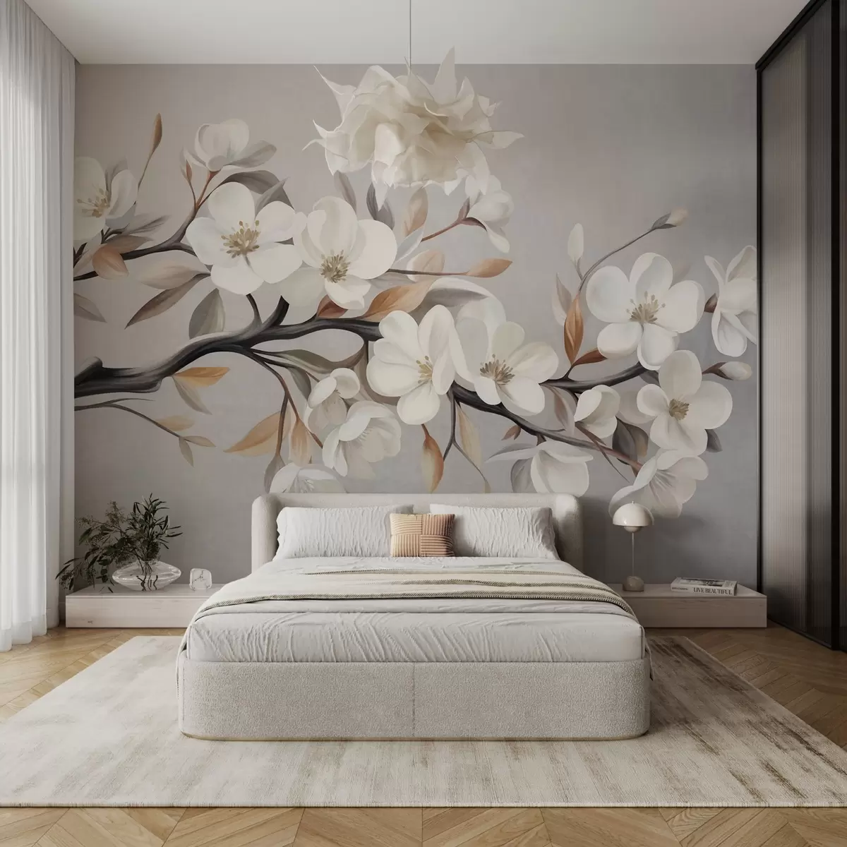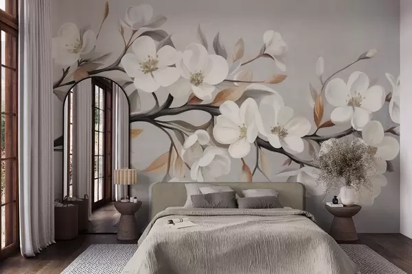 Fototapeten Ein strukturierter Ast mit weißen Blüten und braunen Blättern vor einem hellgrauen Hintergrund N° w09817