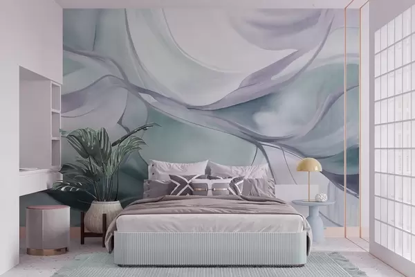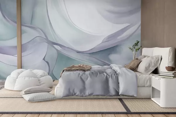 Fototapeten Abstrakte, strukturierte, fließende Formen in Blau- und Grautönen mit zarten Linien N° w09818v1