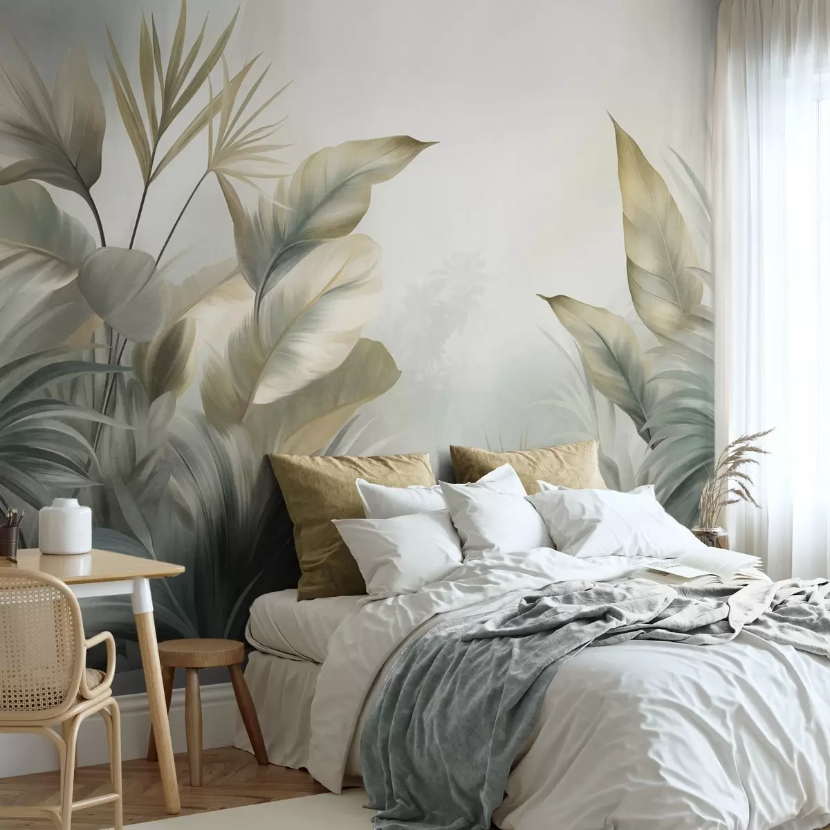 Fototapeten Große, strukturierte tropische Blätter in gedämpften Grün- und Beigetönen, eine Dschungelkulisse N° w09820