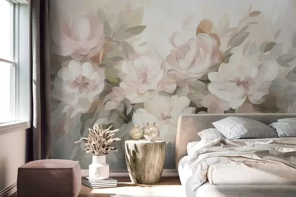 Fototapeten Blassrosa und weiße Blumen mit grünen Blättern, gemalte Darstellung, impressionistischer Stil, strukturierte Kunst N° w09824