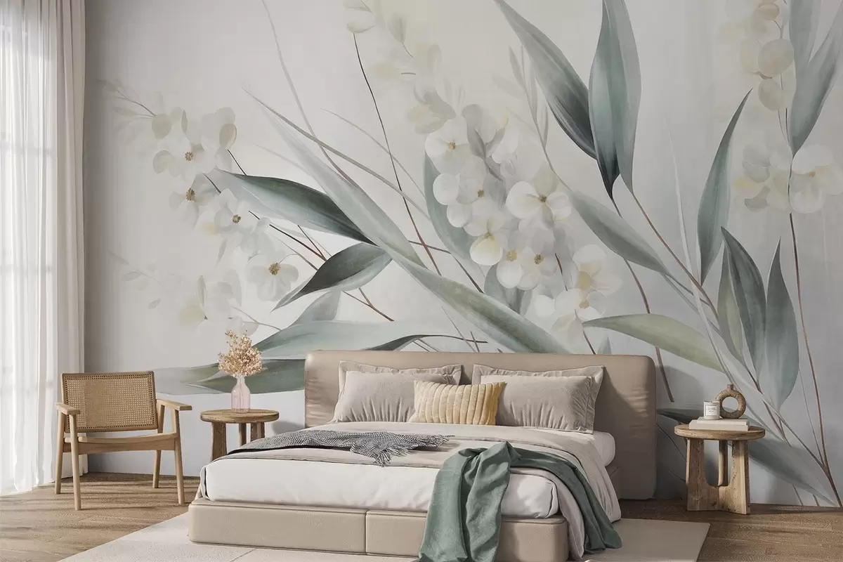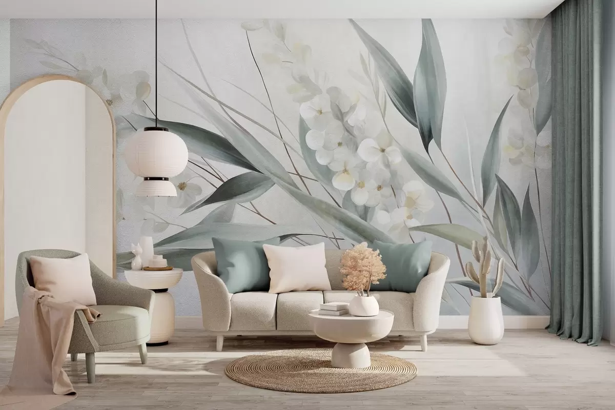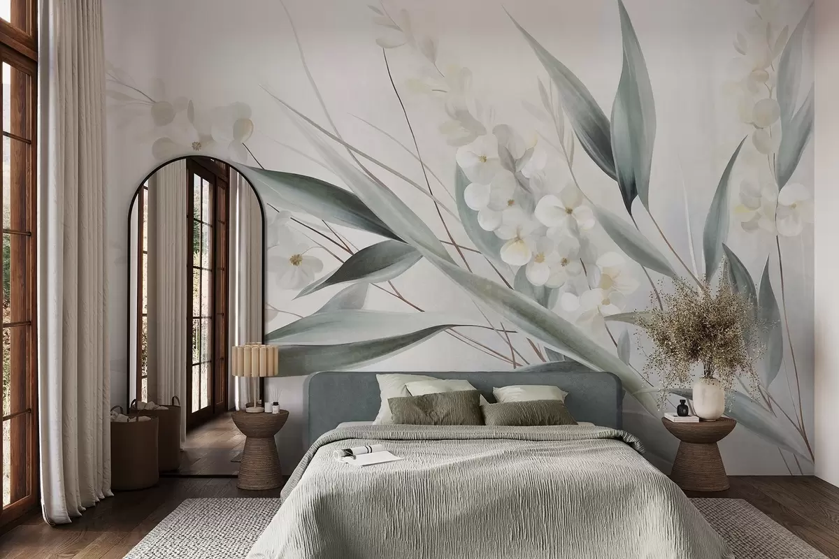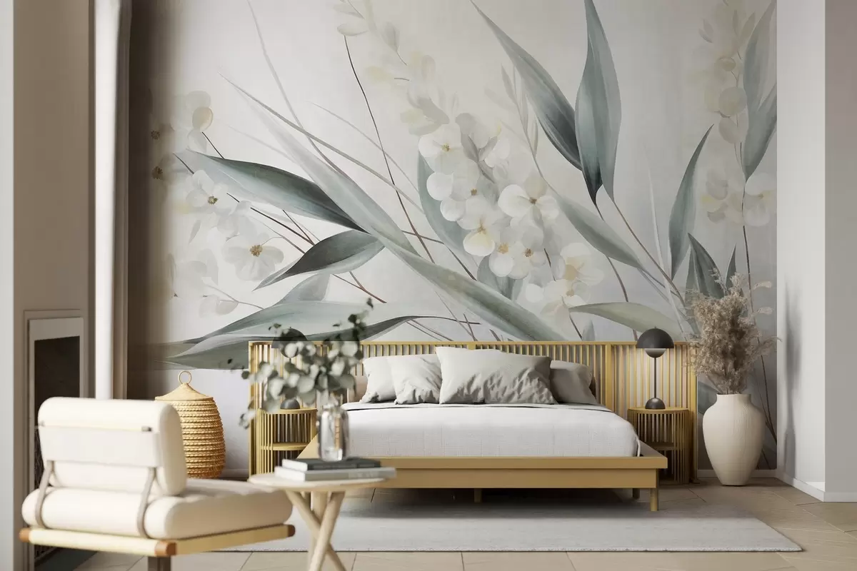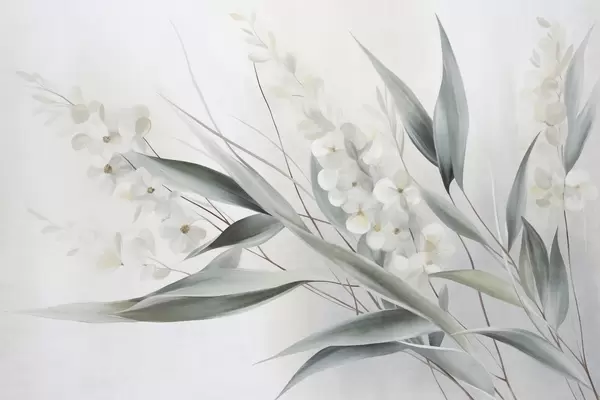 Fototapeten Zarte Blumen und lange grüne Blätter in malerischem Stil mit feinen Pinselstrichen, strukturierte Kunst N° w09827