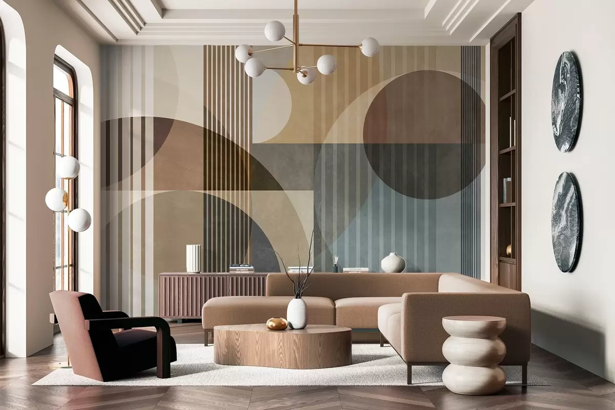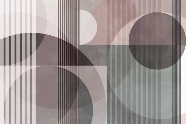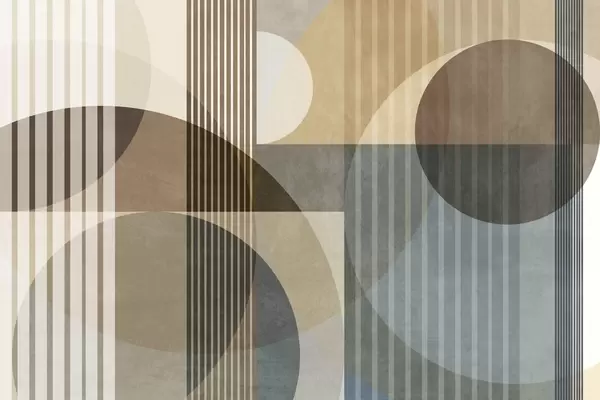 Fototapeten Abstrakte geometrische Formen aus Kreisen und Linien, gedämpfte Erdtöne, strukturierte, vielschichtige Komposition N° w09834