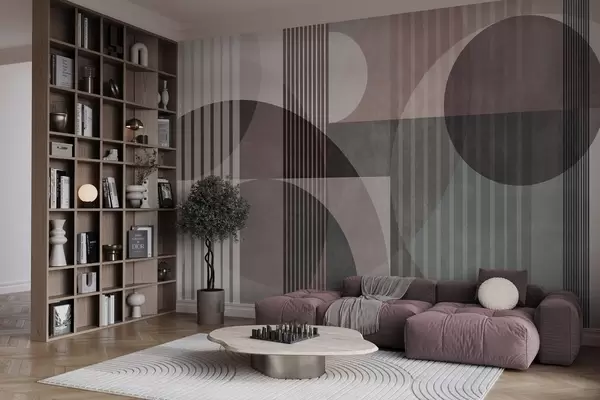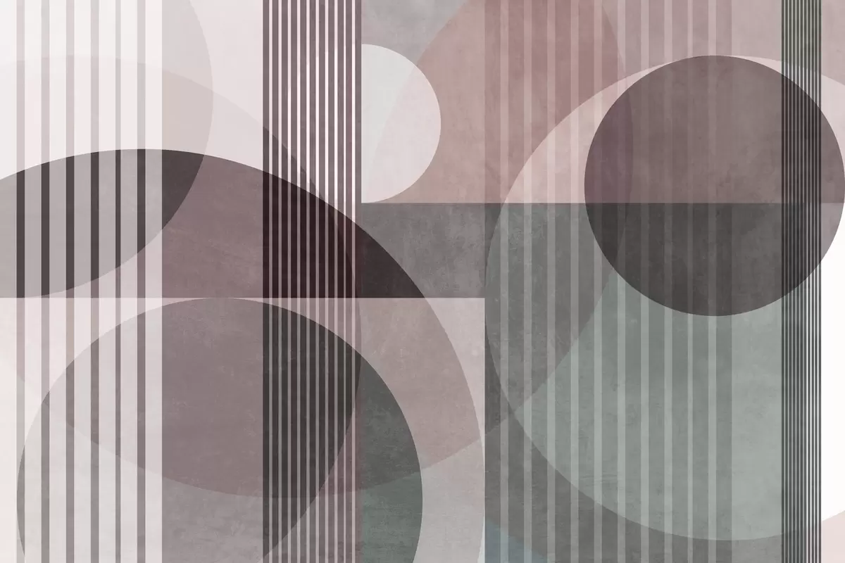 Fototapeten Abstrakte geometrische Formen aus Kreisen und Linien, gedämpfte Farbtöne, strukturierte, vielschichtige Komposition N° w09834v1