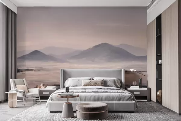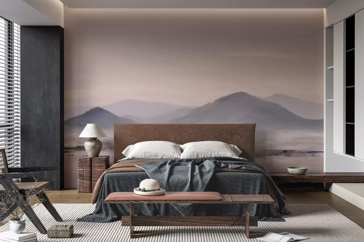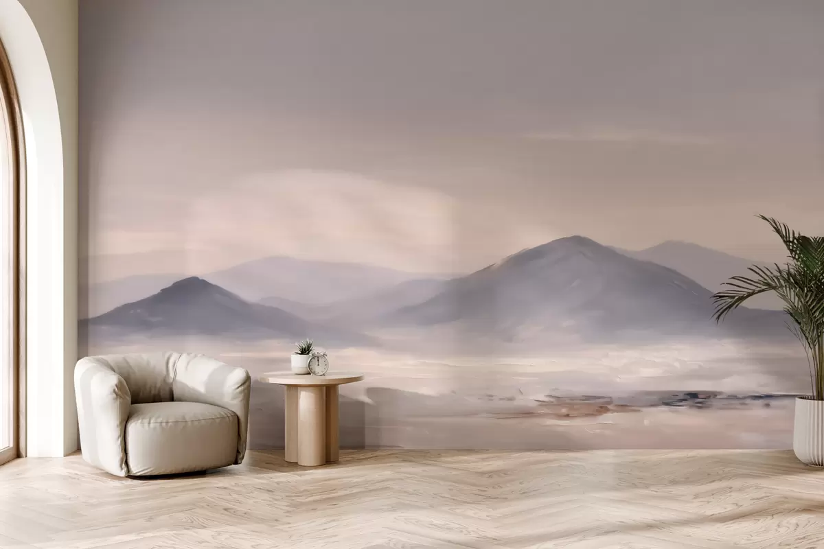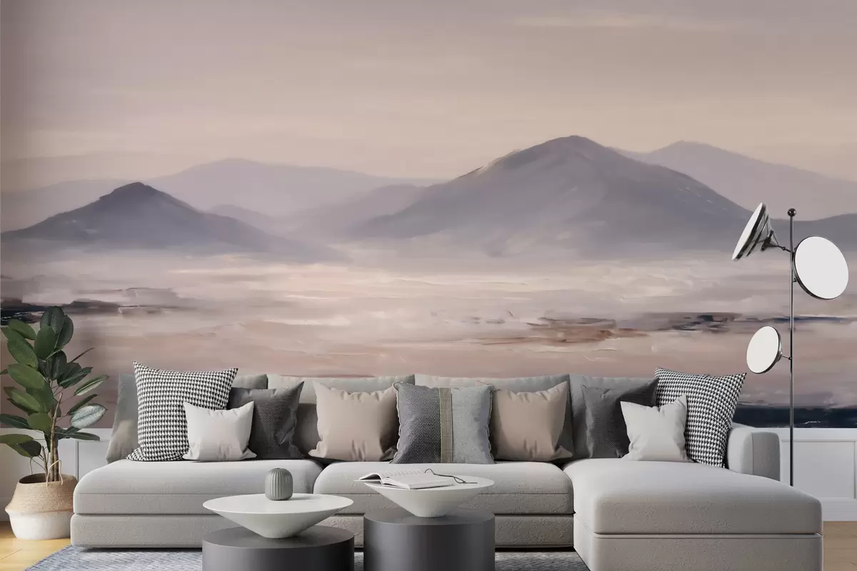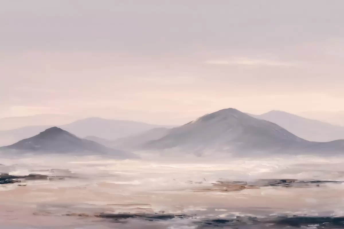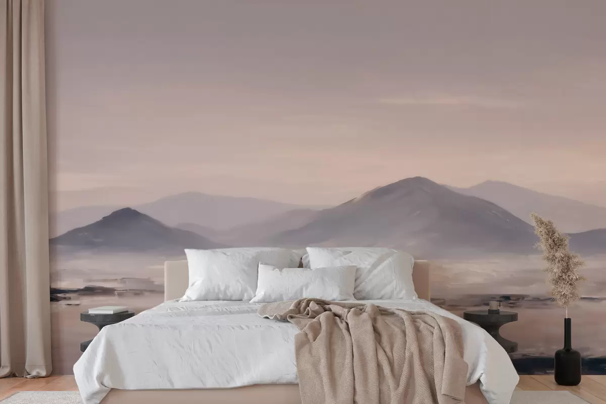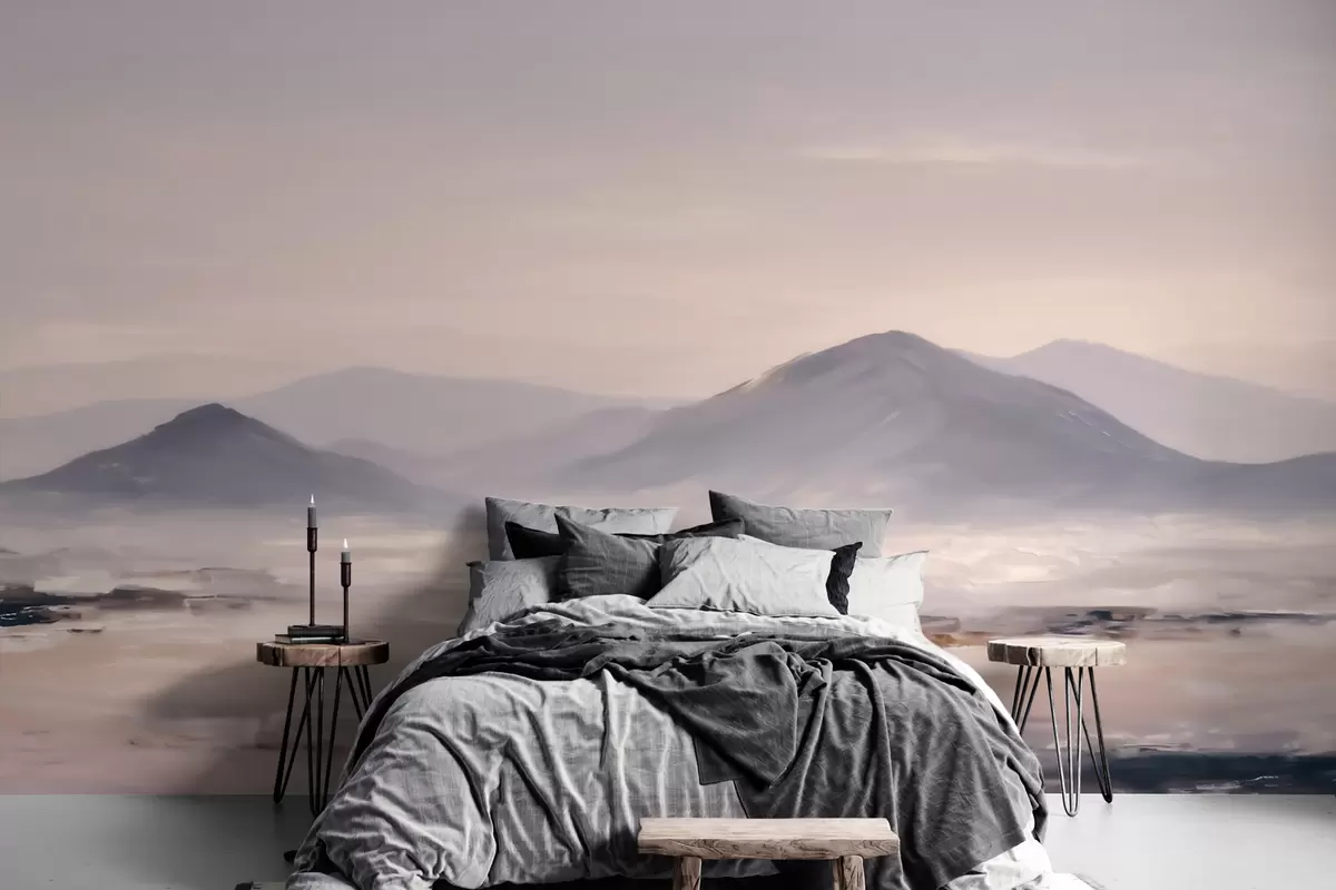 Fototapeten Eine neblige Berglandschaft mit sanften Übergängen von Licht und Luft, die einen maskenartigen Effekt erzeugt N° w09844