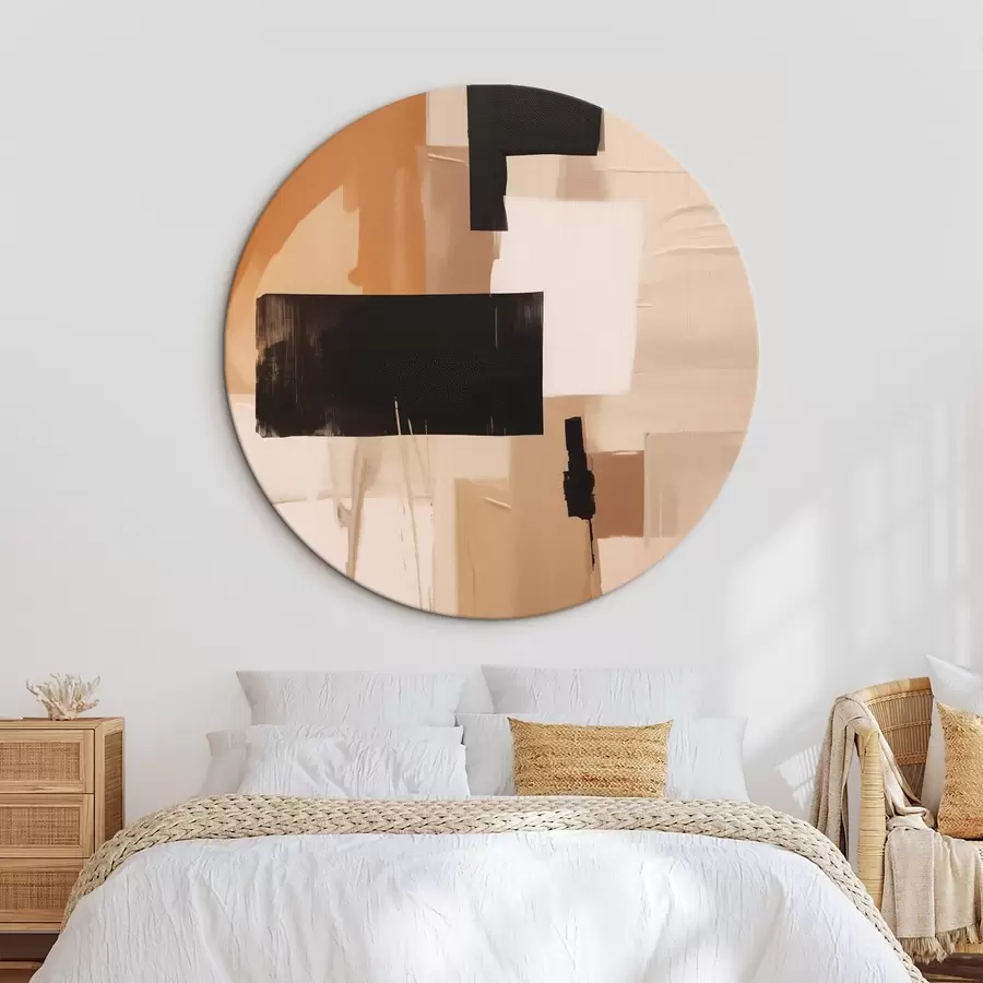 Runde Wandbilder Abstrakte Malerei-Imitation mit fließenden Formen in Weiß-, Orange- und Brauntönen, minimalistisch
