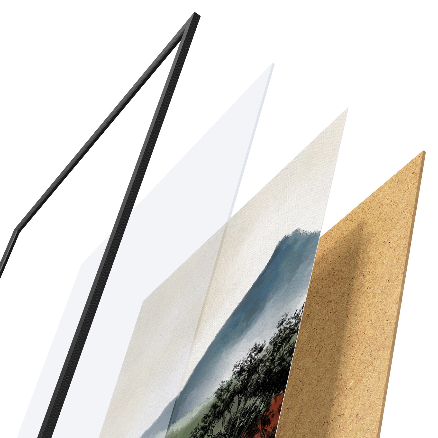 Das Poster besteht aus einem Rahmen, Plexiglas, einem gedruckten Bild und einer Rückwand aus Spanplatten. Dank der Halterungen auf der Rückseite kann das Poster sofort an die Wand gehängt werden.