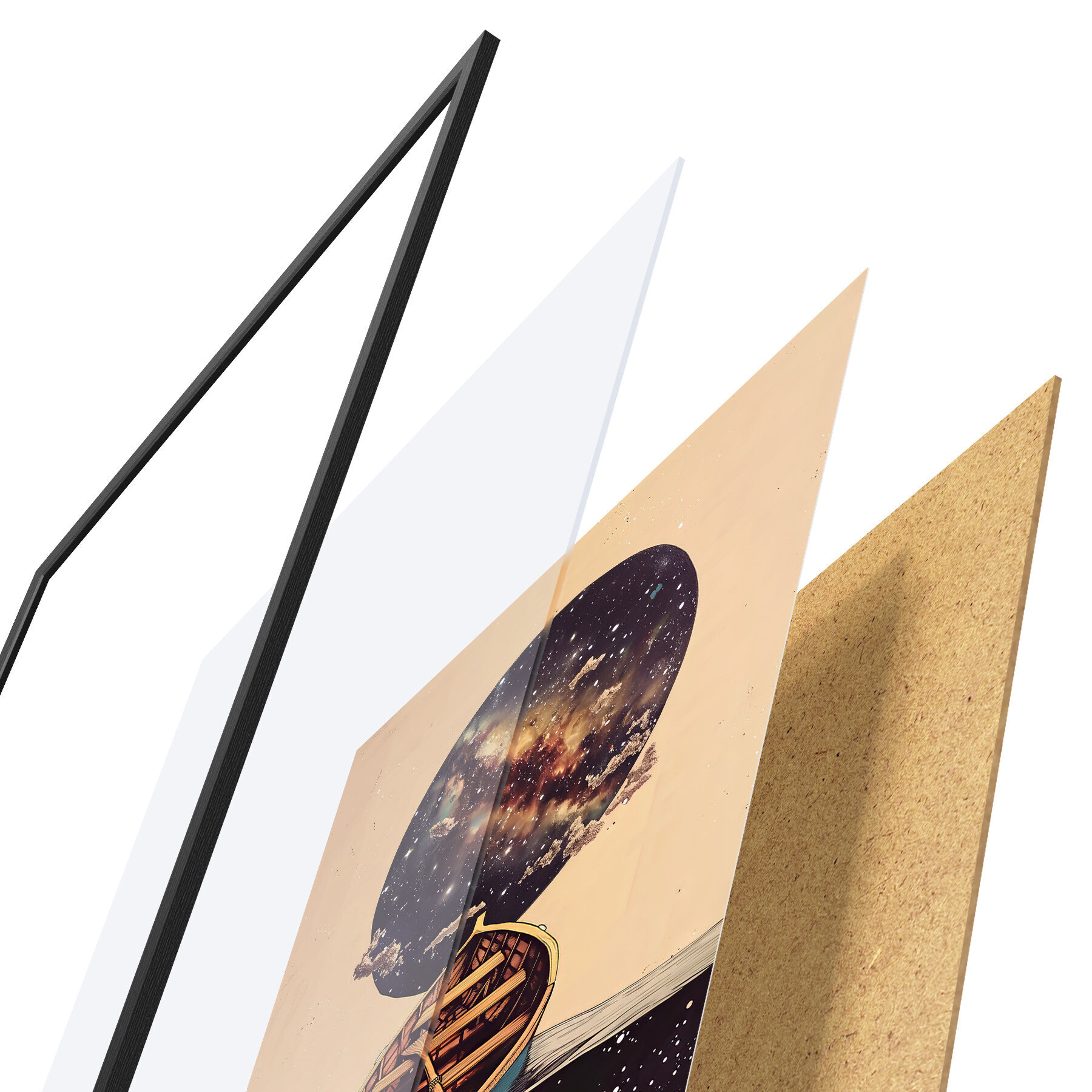 Das Poster besteht aus einem Rahmen, Plexiglas, einem gedruckten Bild und einer Rückwand aus Spanplatten. Dank der Halterungen auf der Rückseite kann das Poster sofort an die Wand gehängt werden.