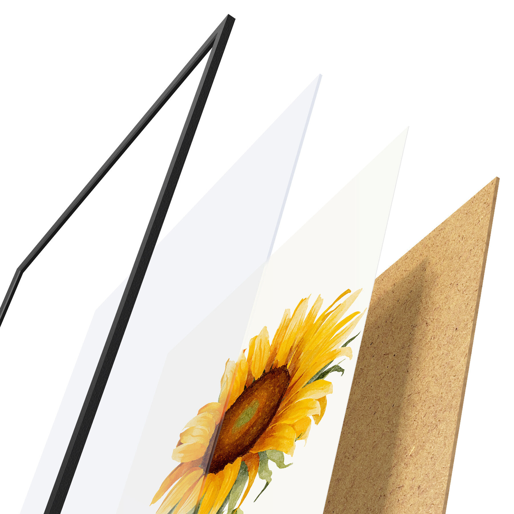 Das Poster besteht aus einem Rahmen, Plexiglas, einem gedruckten Bild und einer Rückwand aus Spanplatten. Dank der Halterungen auf der Rückseite kann das Poster sofort an die Wand gehängt werden.